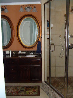 We took this master bathroom and spruced it up! The picture doesn't do it justice. Of course because of the angle of the room, you can't see the whole room. We took out the bath and added this very large shower and added a new closet. There is another bath in this home so it didn't take away from the resale value. If this client ever decides to sell, this bathroom WILL sell the house. We took down the big mirror and added two "round" mirrors - adding shape to the room. On the mirror wall we used a beautiful terra-cotta paint color and then on the rest of the walls we used an amazing silvermist green. We used the wall color on the ceiling too (of course after we scraped all the popcorn). We put in granite and stained the cabinets a rich walnut. We finished the room off with the details - new hardware on the cabinets, new fixtures and new lighting.
