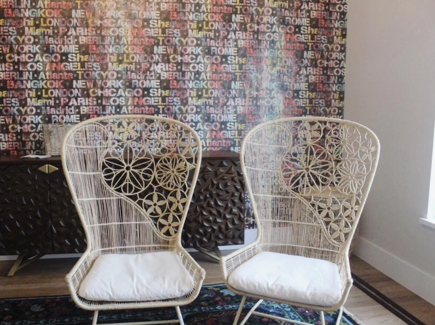 Also, how fun are these peacock chairs?? They are going to add so much texture to the room. The wallpaper is from Yorkwallcoverings.com and they were so generous to donate it to us. I wanted a touch of “global” added to my design and this is it! What teen doesn’t want to travel the world?