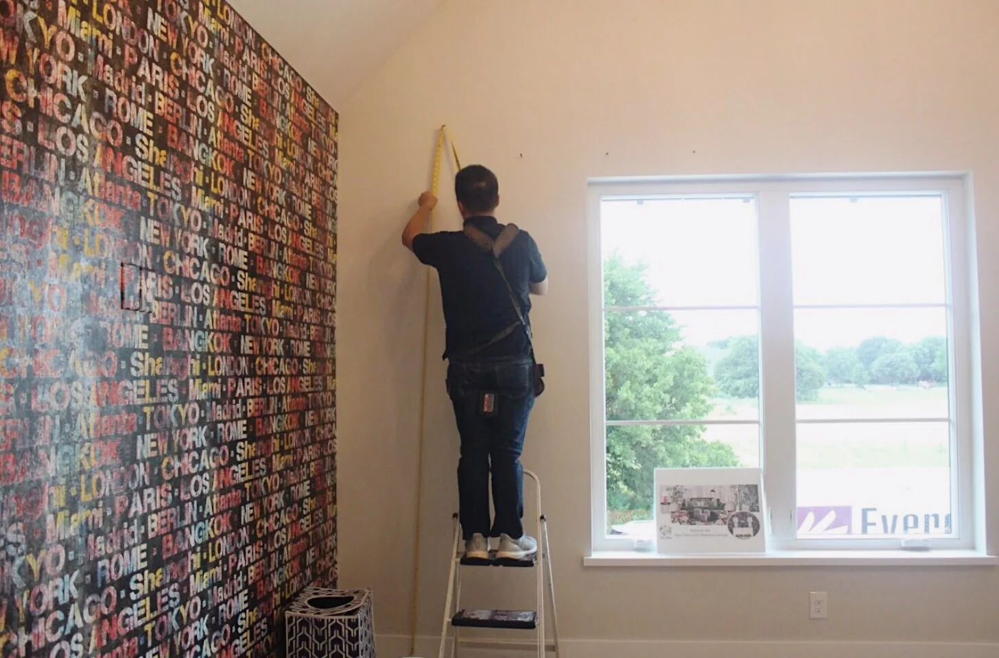 After unloading all of our supplies, it was time to start deciding where all the pieces should go! I wanted to create a gallery wall in the room with “collected” items. My spaces don’t look like a showroom; I like to make them feel lived-in, relaxed, and comfortable. I like to lay out the collections to see where they should be placed on the gallery wall before we start nailing things up. I definitely had a plan, but on install day we get to be creative once we are in the space and see how things look once they are all together. I usually bring way more items than needed so we have choices.