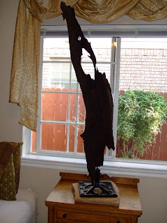 We recently went on vacation to the beach. I was determined to find a piece of driftwood so I could use it somehow in my decor in our new home. We spent a day walking the beach as a family trying to find the best piece! The girls had a blast collecting shells and helping us find this treasure. After several hours, we found it! We marked the spot in the sand so we could drive back to the beach and pick it up later that evening. I knew I loved the piece because it had character and wonderful shape. We hauled it home and let it sit until I came up with an idea for it. Right before I left town for my birthday weekend with friends, I told my husband that I'd love to see the driftwood stained and put on a stand of some sort. I kinda described my thoughts to him (he is so wonderful about all my crazy ideas). Well, guess what he did? While I was gone, he and the girls stained it and did exactly what I expected, put it on a stand! It's amazing and far beyond what I imagined! The memory of walking on the beach with our family and picking it out together is the best part of this gift!