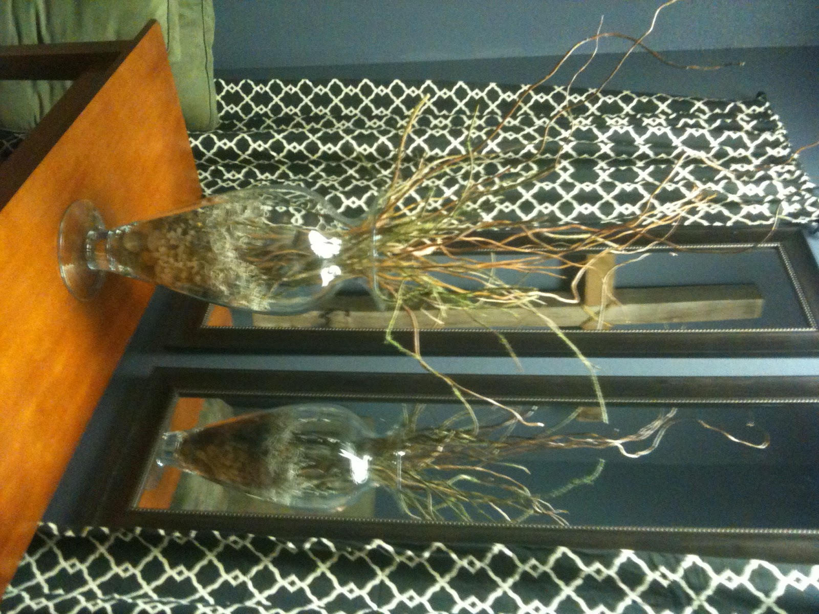 I took apart an old arrangement, cleaned the glass vase so it was sparkling and new and added some pebbles and moss. Now we have a refreshed arrangement!!