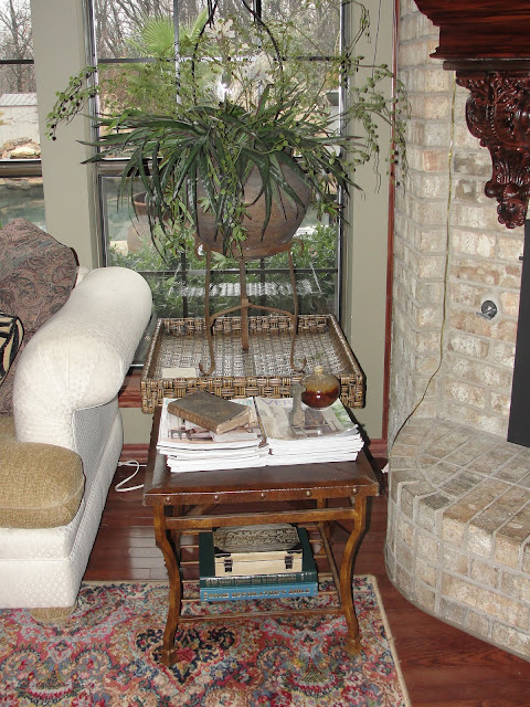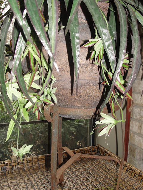 After taking my tree down, I changed things up a little and needed something where the tree was. I shopped around the house and "used what I had" to create it. It still needed something after I finished.....I then remembered I had the wrought iron finial and placed it in the pot. Now I like it.