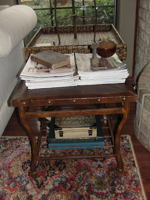 I love this little side table I found for $10. It was terribly dusty and worn when I dug it out of its misery. I polished it up and cleaned the leather top and wrought iron base and it's wonderful now. If you have the space, layering tables like this creates an interesting vignette.