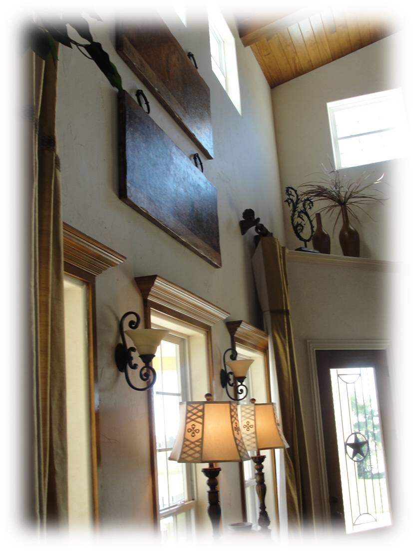 Added gorgeous hand painted wall art.  Artwork and draperies can create amazing height to any room.