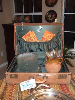 I put all the plates, napkins and silverware in an old vintage suitcase. Decorated with other suitcases on the table as well - going with the whole travel theme. I put luggage tags on the suitcases and put sayings on the tags like "life's a trip, wish we were going with you", "we'll miss you", etc.