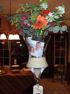 I made a floral arrangement and put their photo's in the vase. It really made the flowers personal. I gave the flowers to the guests of honor after the party was over.
