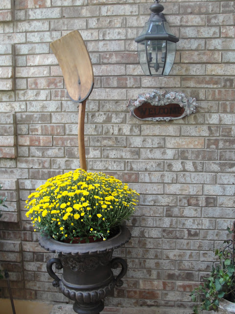Here is one of the ones I purchased for my front porch. You can see where I put the old antique shovel that I posted about a month ago. I'll find some raffia to tie around it and it will be perfect.