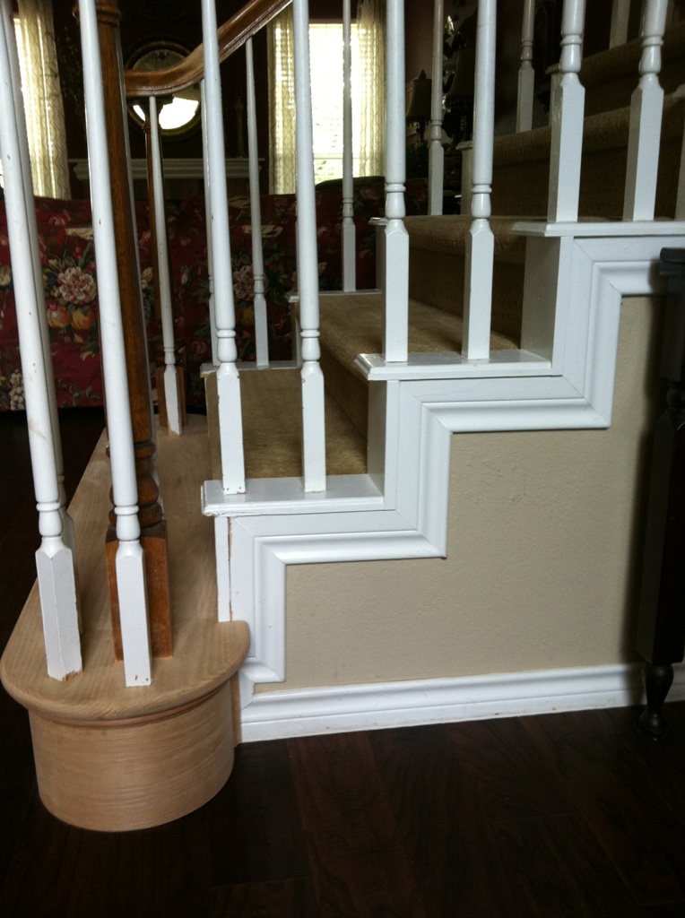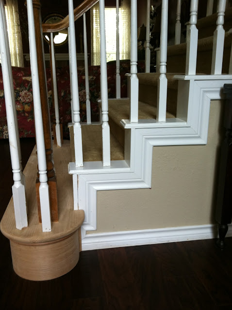 I suggested that she stain the "oak" banister because that made it look dated.  It needed to match the new wood floors.  I also suggested she paint all the spindles black which is what really made this staircase look updated!  The side molding was also painted a dark rich khaki (looks lighter in this photo).