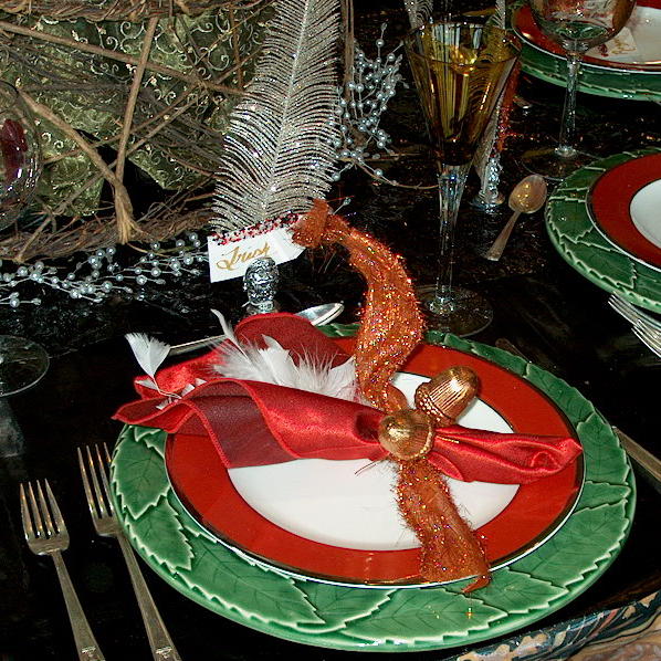 Tied the napkin with some burnt orange ribbon to complement the ribbon on the swag and added some winter acorns. Each person had a handwritten name tag (slipped into my silver name tag holder's) and their own personal sparkly feather.