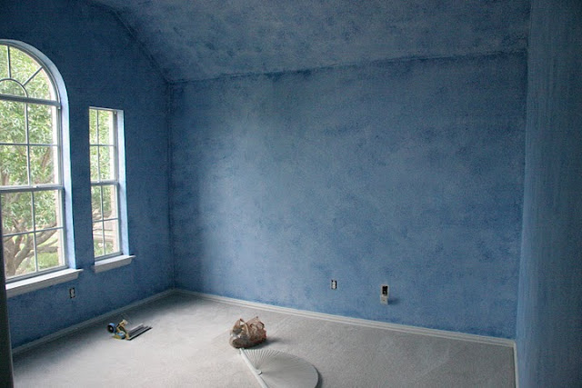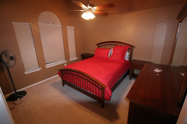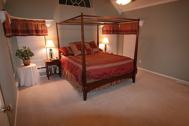 Blue had to go!  Now it's so much warmer and comfortable, especially with this red bedspread.