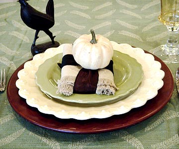 Looks like this is their formal china but they added a gold leaf and there's your fall touch.  Using a bracelet (elastic) around your napkin is an inexpensive way to make a dramatic look too.