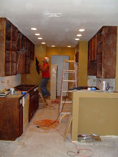 The crown molding is up and the stain is about to receive a satin finish on it. See how the wood crown molding makes the cabinets finished as well as making the color on the walls come alive.