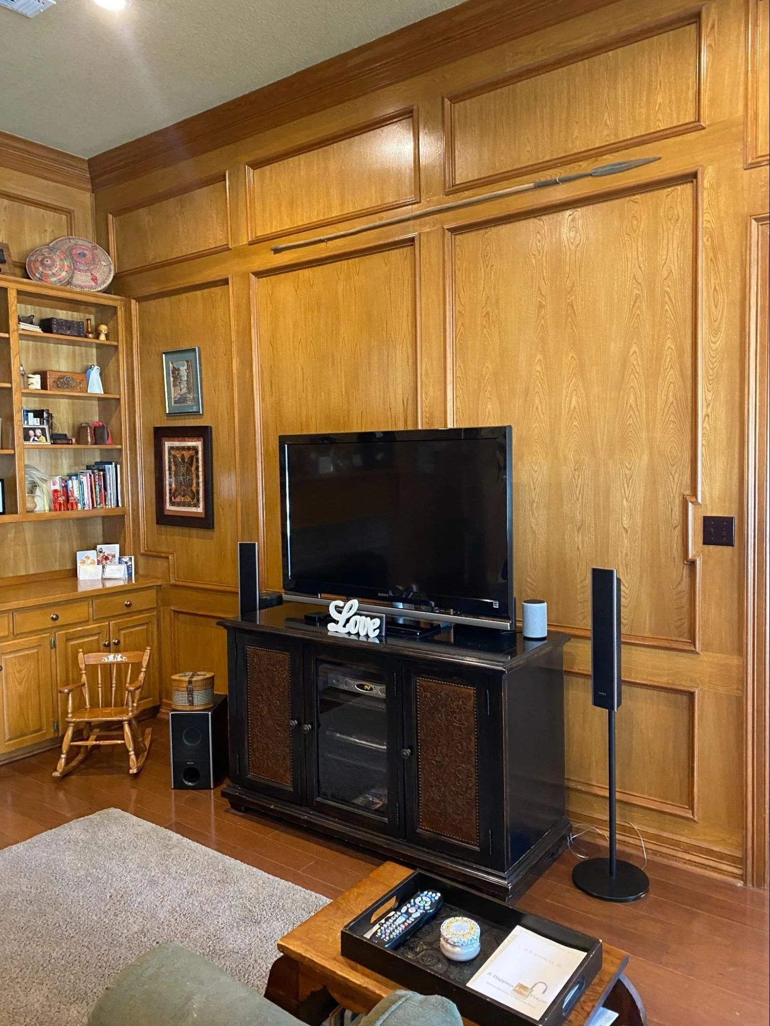 The family room was paneled and I encouraged the client to keep it but paint it a gorgeous color. I adore the look of painted paneling if done right and knew this room could handle some color.