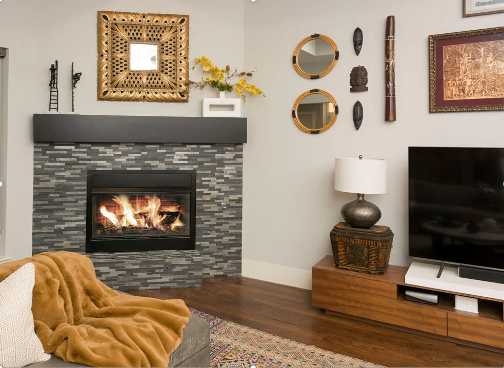 This raw edge black wooden bowl really works well on the round coffee table. The heavy marble ball with the gold rim works well with the fireplace mirror. Notice how we purposefully layer accessories. We add just the right groupings together so it doesn’t feel too cluttered and busy.