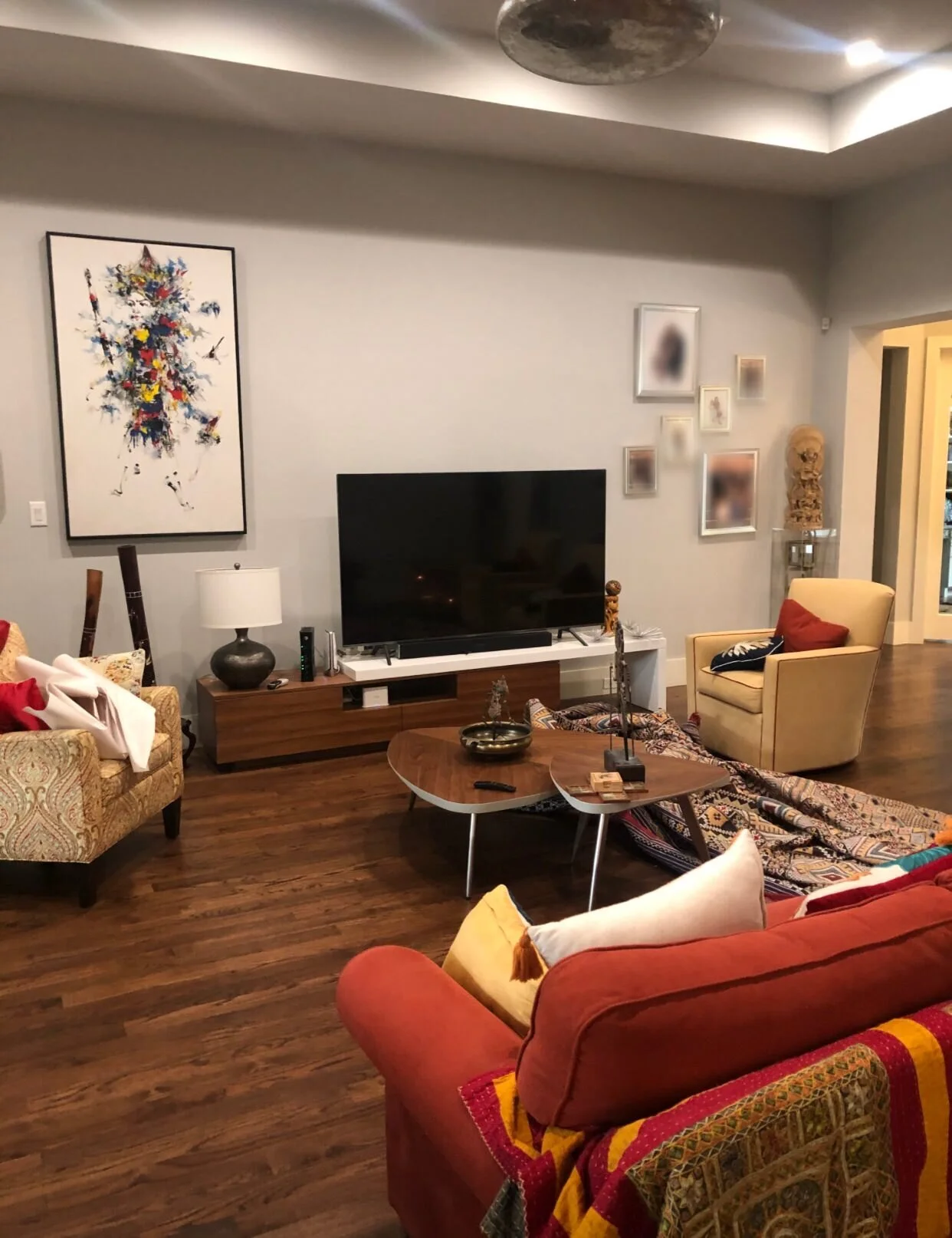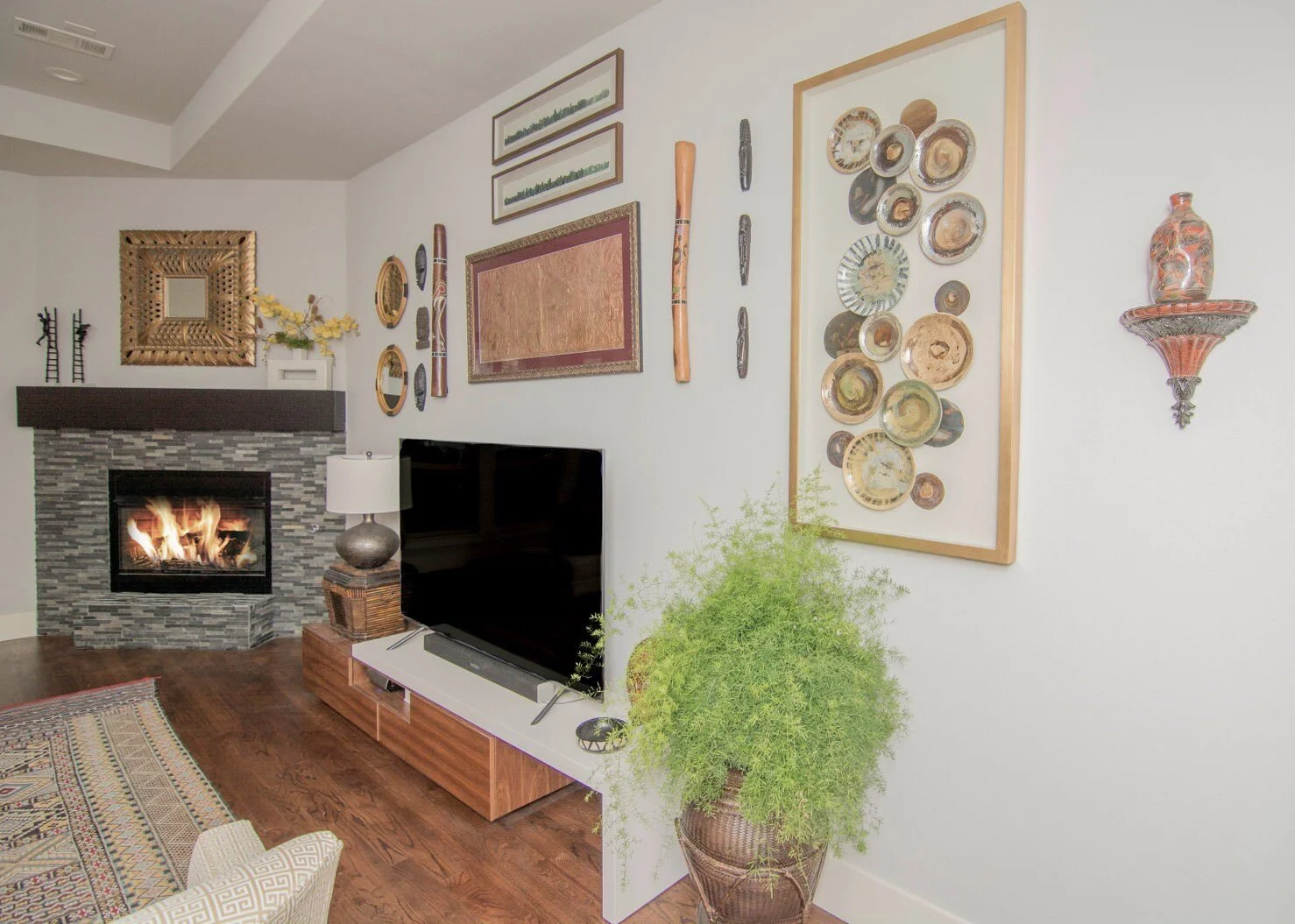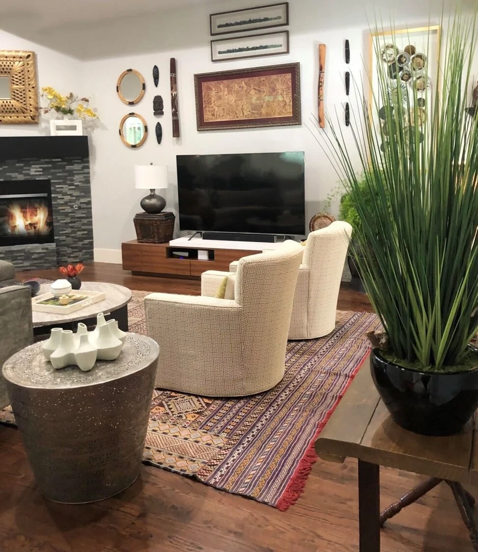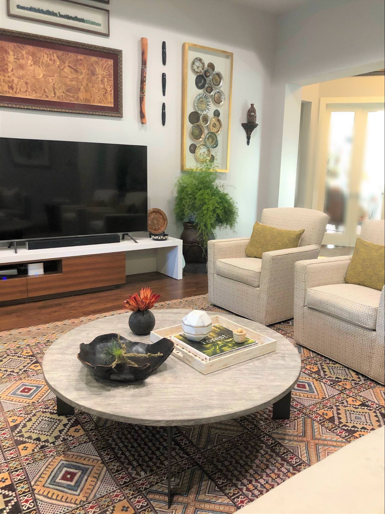 The gallery wall is my favorite part of this room. They had so many great pieces of art that we knew we could really make a statement behind the television. Masks from different countries, rain sticks, framed tapestries and pottery.