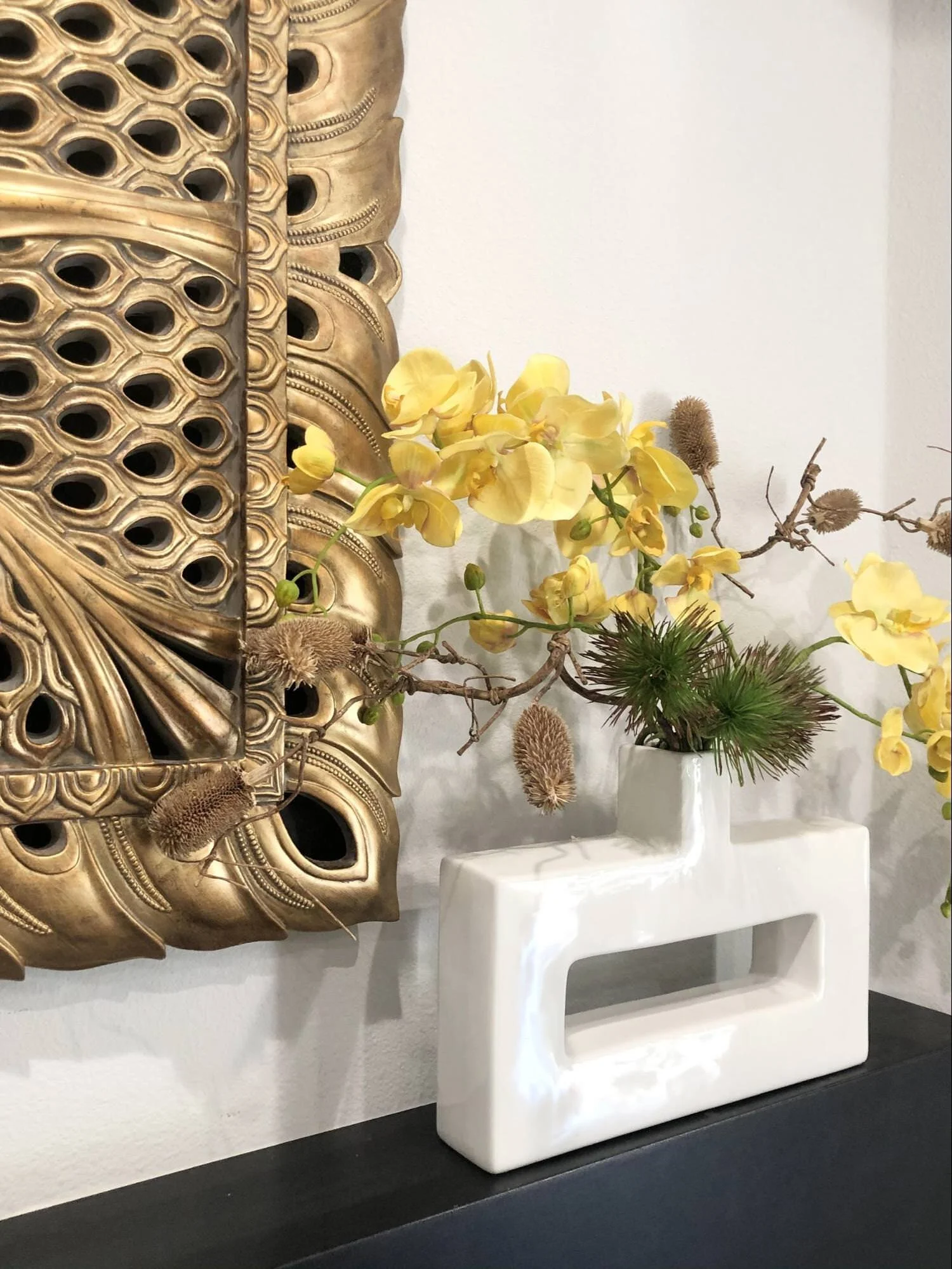 We placed this white ceramic vase on the side table and it really adds a fun and unexpected element. I can see the client adding fresh flowers to this for the holidays.