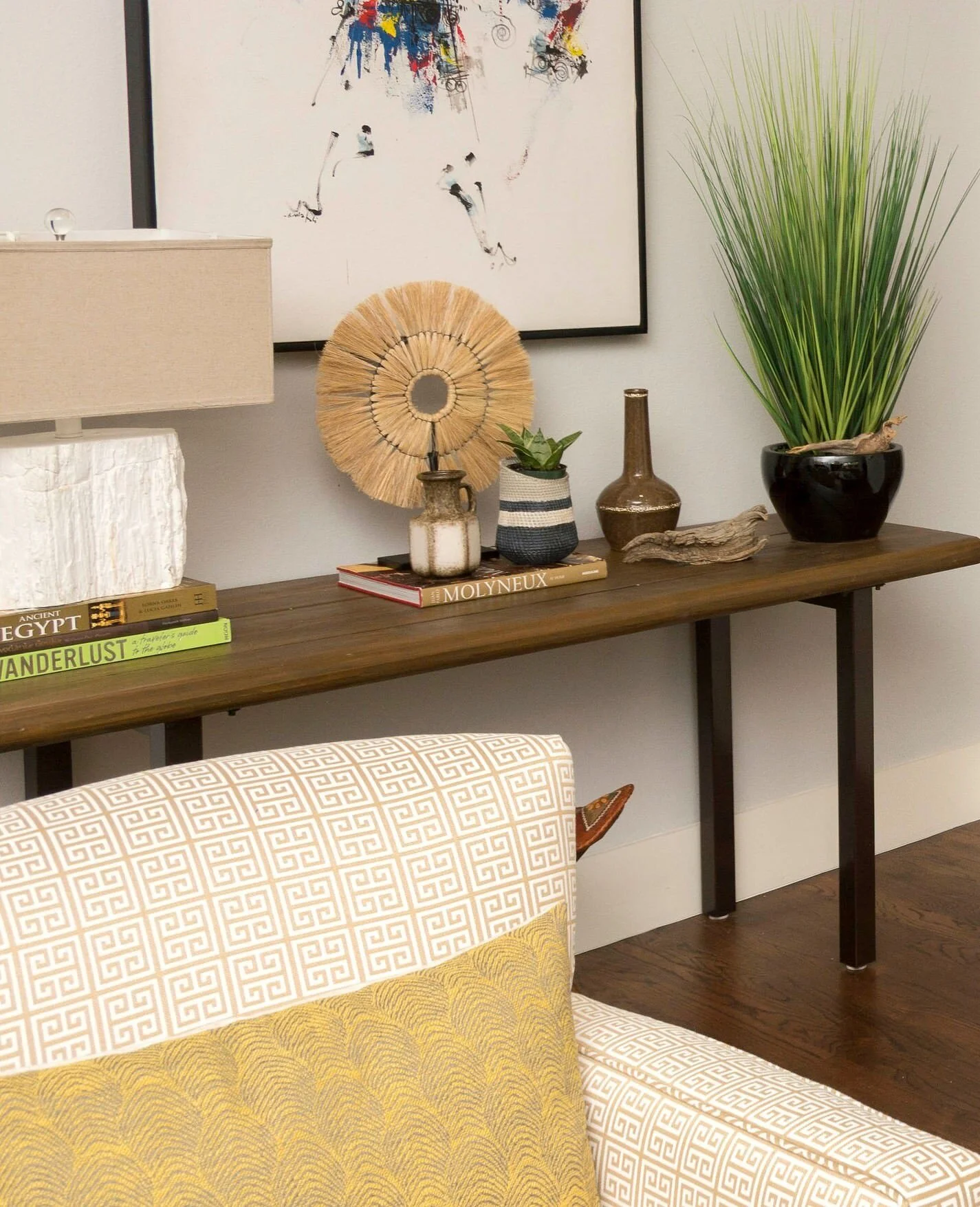 Using a narrow console table is always a great idea in a hallway/walkway space. We were able to use a big piece of their colorful artwork above the console table and it added that splash of color on that side of the room. Again, we used some of their accessories and added in some new ones as well.
