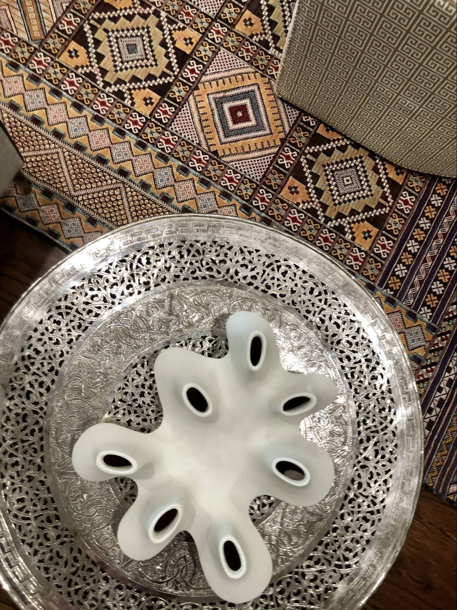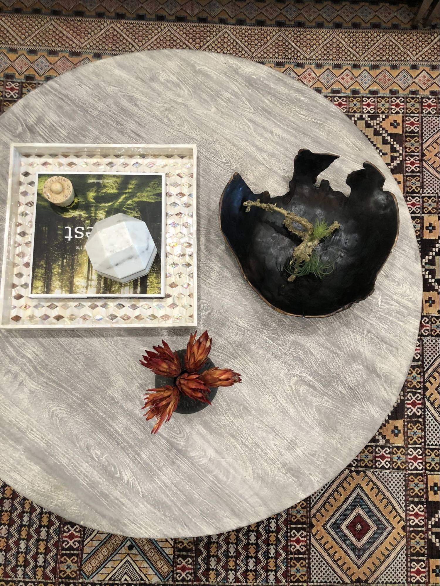 We used a shell inlay tray to layer some books with accessories. The dried African proteas bring out that touch of red to compliment the rug.