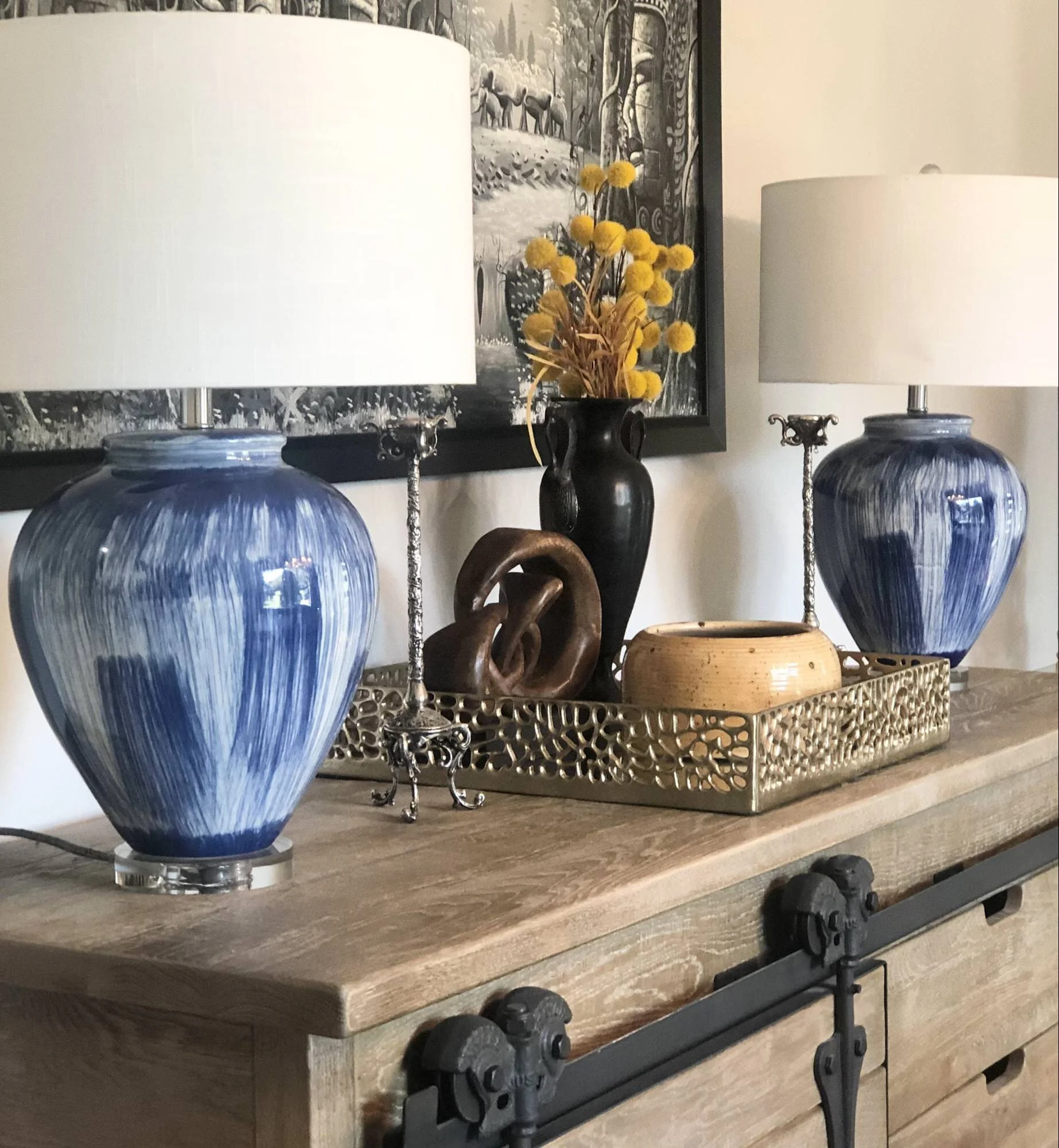 The before photo shows you that the client had a lot of the same textures and colors which makes nothing stand out. We brought in art from another part of the house and paired it with these blue and white lamps, aren’t they fabulous? Again, we layered accessories of different shapes and sizes on the buffet with a pop of texture and color. The lamps will work beautifully with the blue and white draperies.