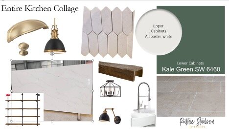 I suggested to the client that we paint the lower cabinets green because I felt like it would give the kitchen a warmer more inviting feel. Because everything else we went with was in the white/cream family, I knew a strong, bold color would bring life into the kitchen. When I think of England, I think of lush green fields and beautiful green pastures. I chose Sherwin Williams “Kale green-6460” for lower and SW Alabaster 7008 for the upper cabinets.