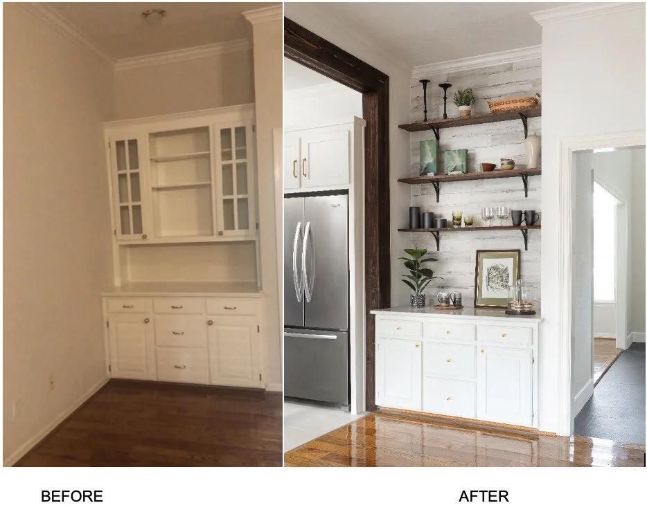 I also redid their coffee bar which use to be more a part of the family room. We took down the storage cabinet above, added some rustic beadboard and custom walnut shelving to display accessories. It now feels as it it’s a part of the kitchen and I know they will use this space a lot for a drink station, appetizers, etc.