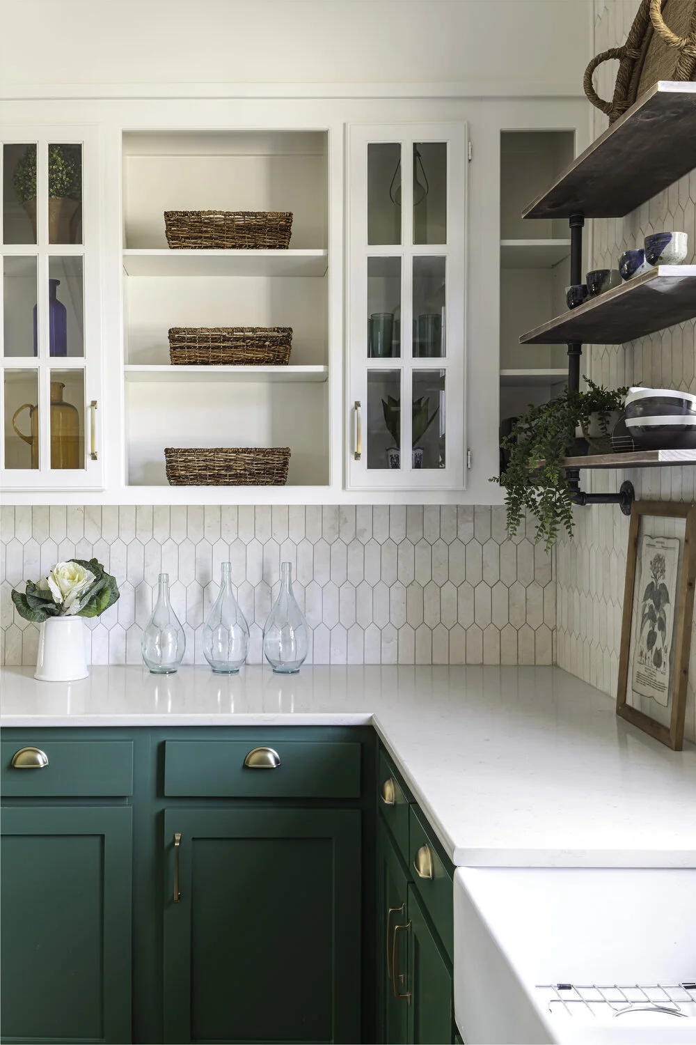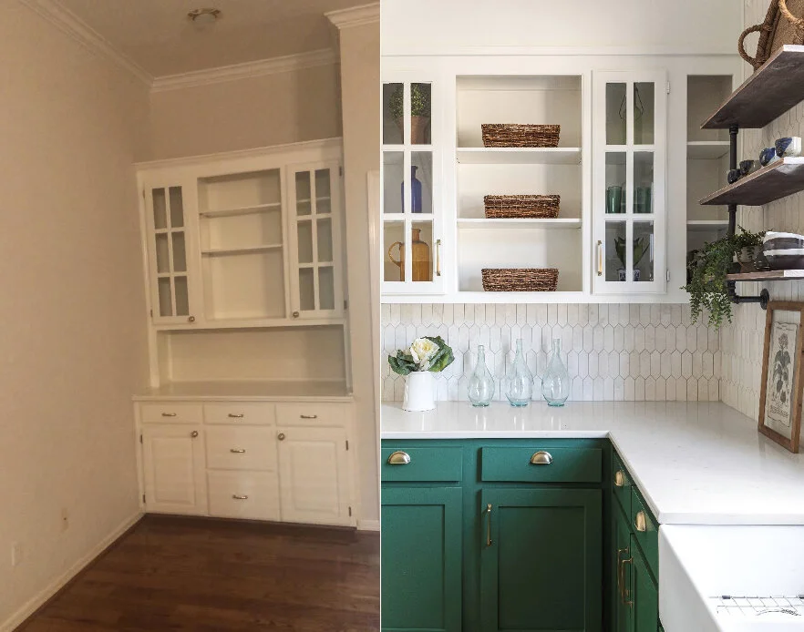 We took down some upper cabinets because there was plenty of storage in the kitchen. I’m usually not a fan of open shelving because it can make a kitchen look cluttered and busy. However, the client really wanted to display some of her pottery collections from her travels and saw what she had and realized it would look beautiful.