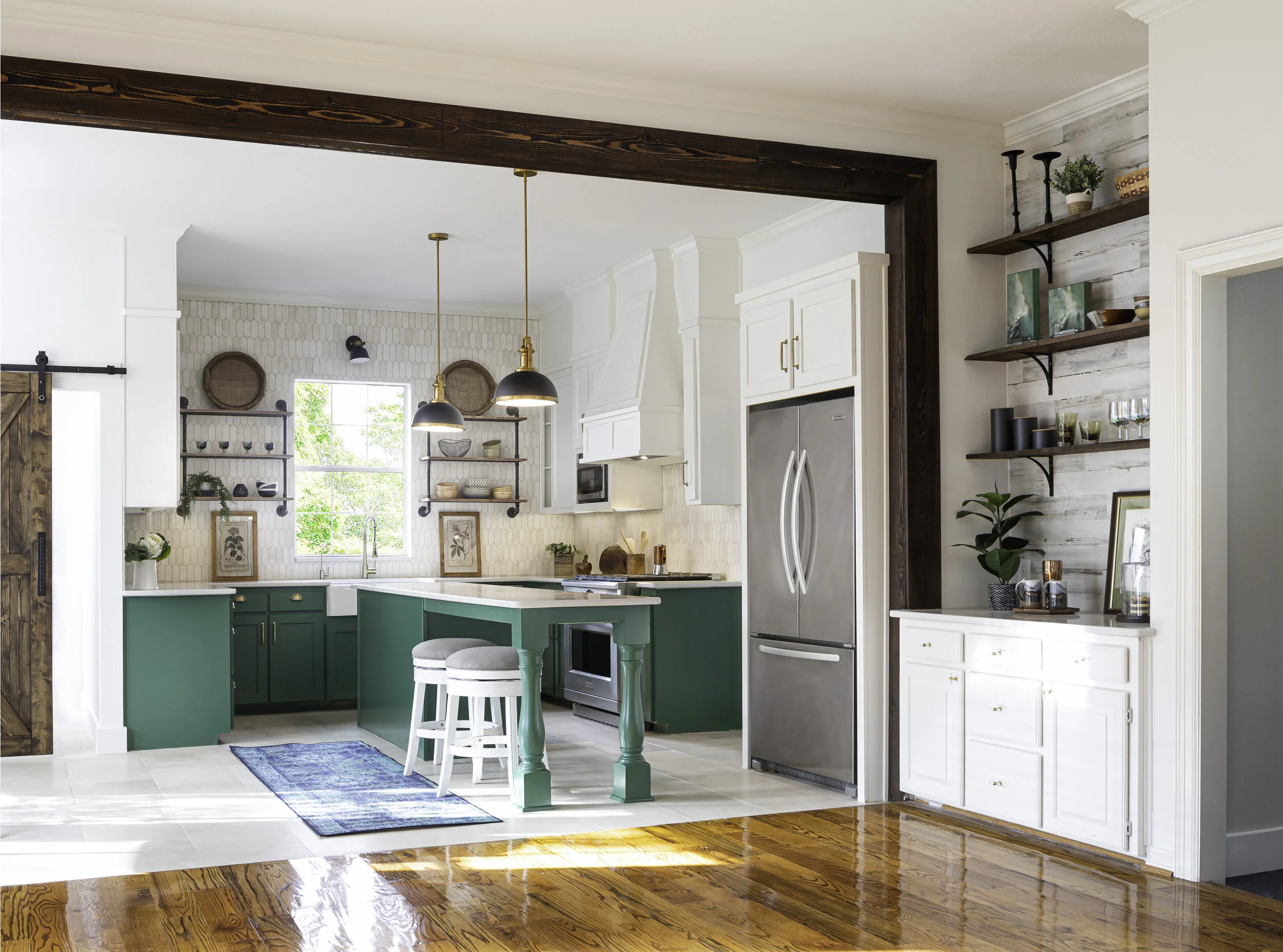 I knew that the kitchen could be opened and reworked to allow an extra-large island, open shelving, beams, and gorgeous tile work.