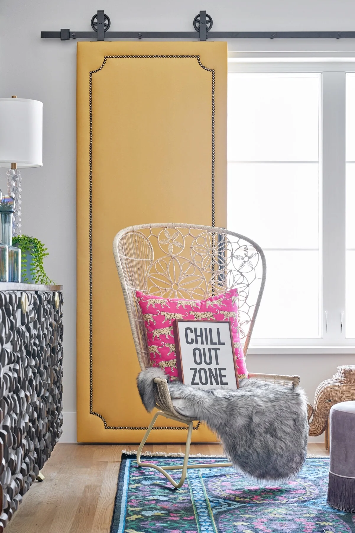 Perhaps one of my favorite parts about the room are these large yellow barn doors we created. They are leather, and can close all the way over the window! To me, these barn doors seemed more unique and fun rather than traditional draperies. I’ve not seen this done before and thought why not?