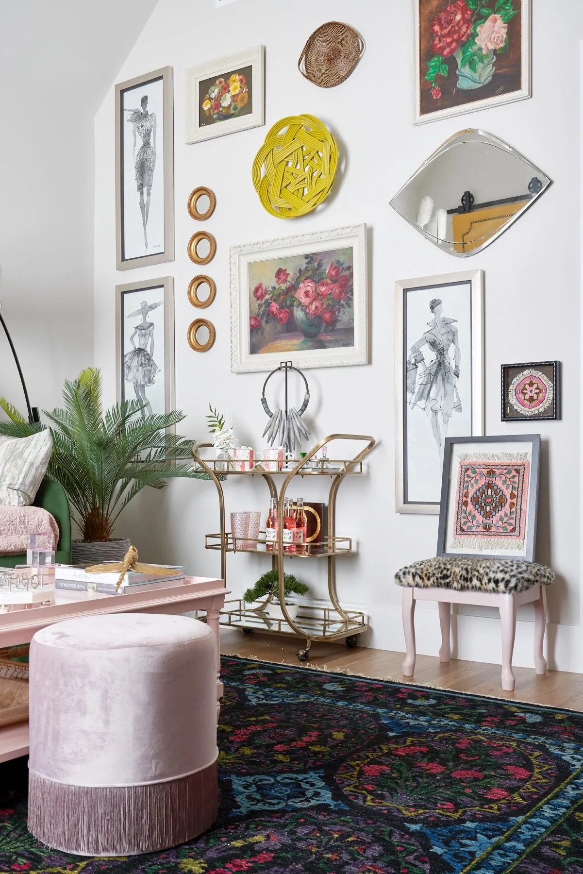 I really wanted to add artwork in this room that would give a pop of color. This gallery wall features modern pieces that break up the floral, and makes the room feel more sophisticated. Adding old with new pieces created a collected look and keeps it interesting. Thanks to Uttermost.com for the black and white fashion art.