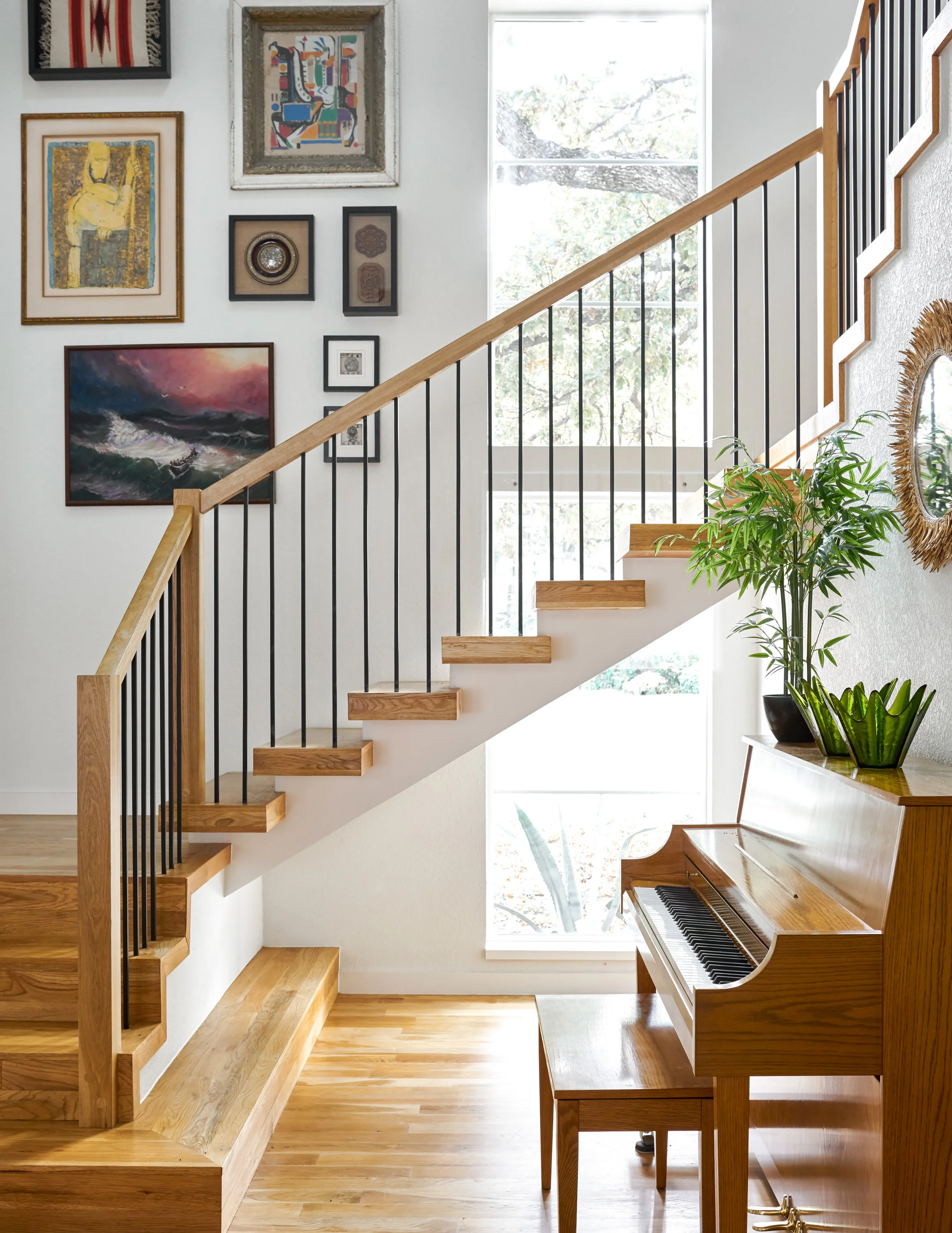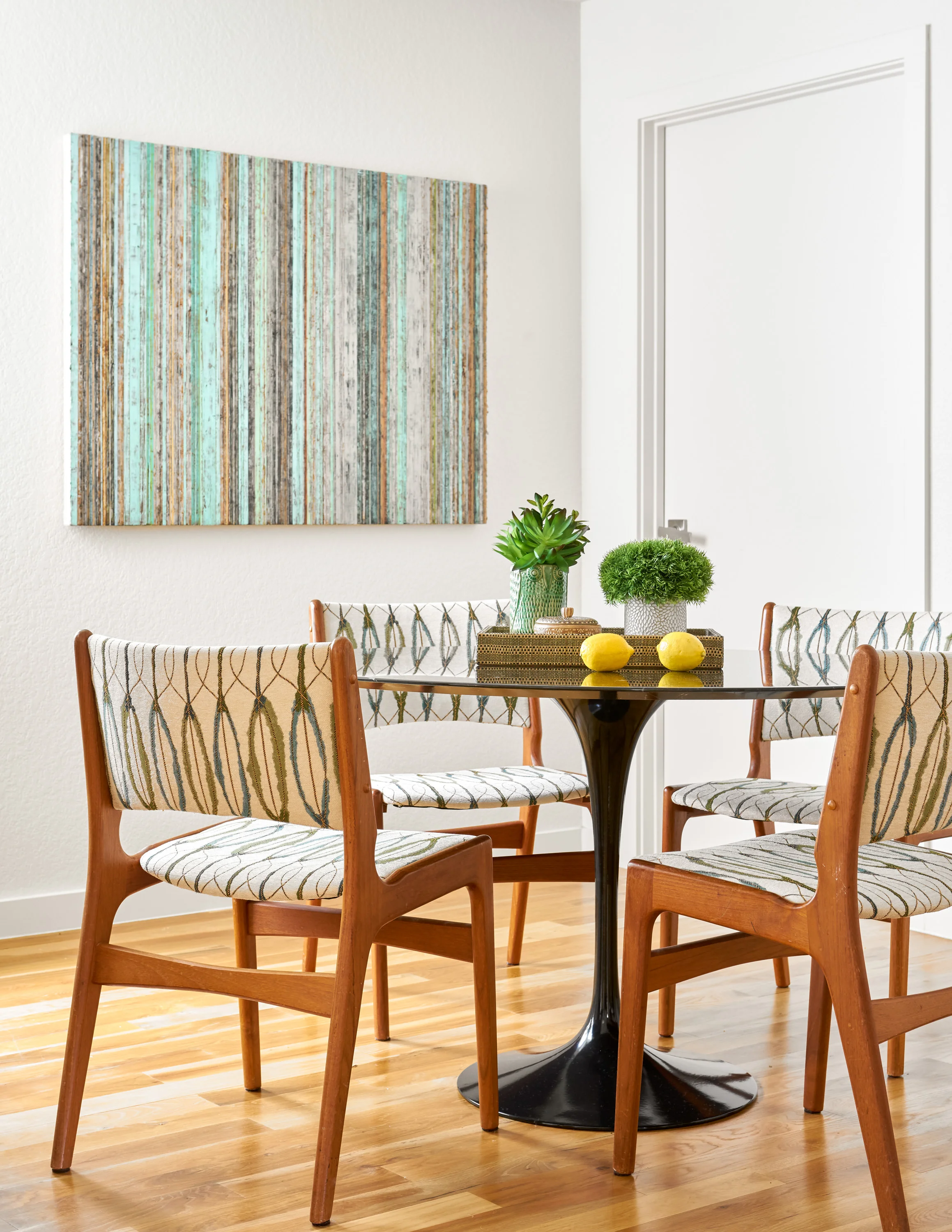 The simplicity of this room with the white backdrop is stunning. Love the pops of color that make it look so happy but not too overpowering. The yellow swivel chairs compliment the honey floors so well. Also, anytime you can use marble in a room, it’s a good idea!