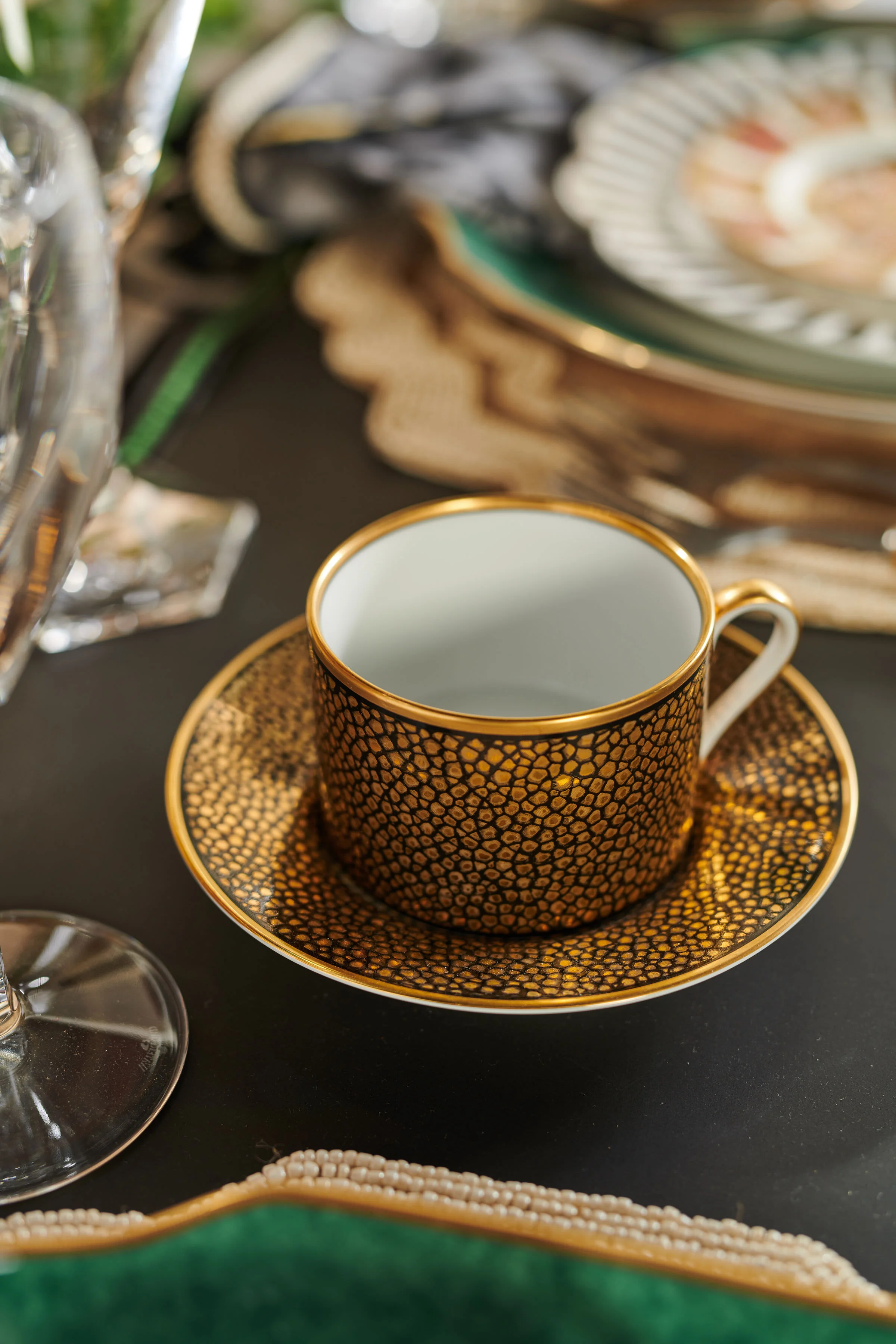 The coffee cups are gold to work with the gold lamps. Yes- as a designer, we think of every detail and we make sure that there is a connection with each piece we add to the table.