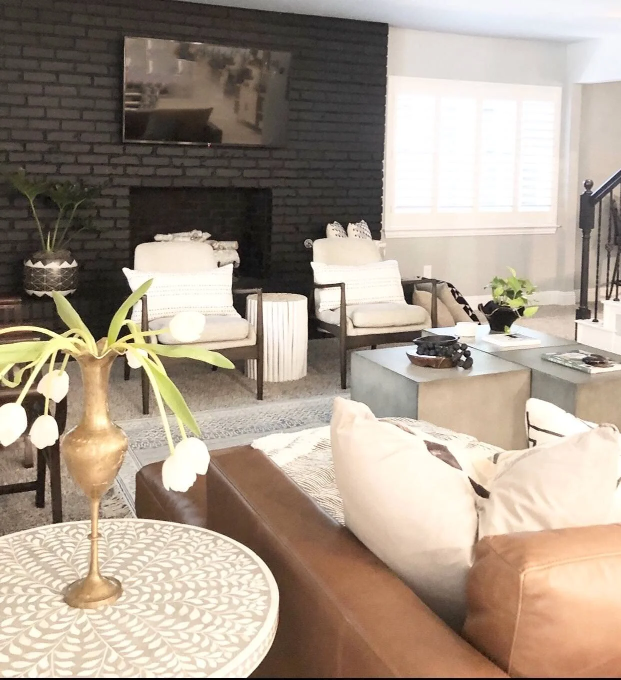 I suggested that we paint the brick black so that the TV disappears. If you are going to hang a TV above your fireplace, this is a great solution.
