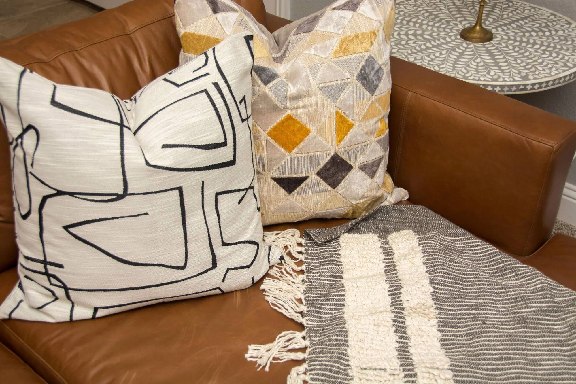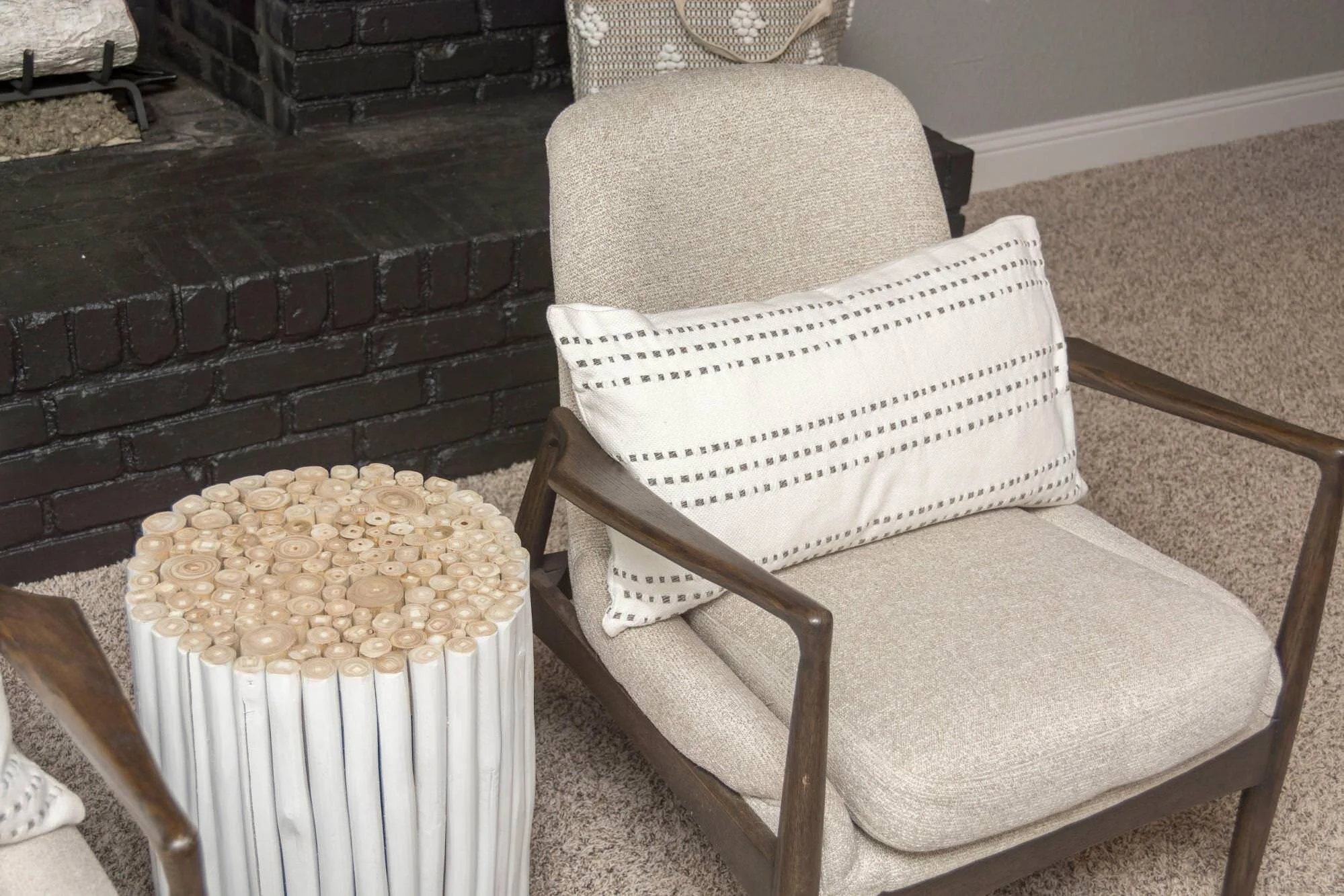 White lumbar pillows added a softness to the chairs modern curves. The wood side table was one of my favorite pieces that we added.