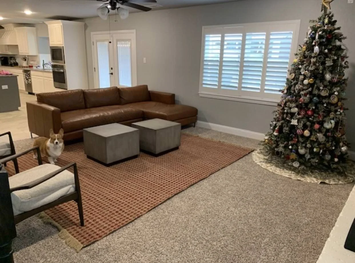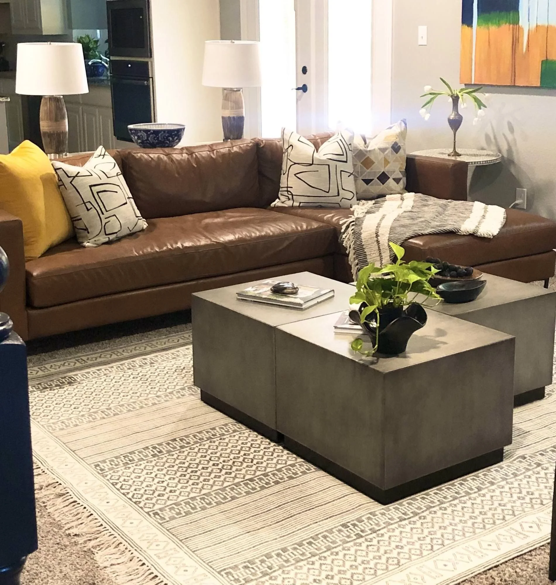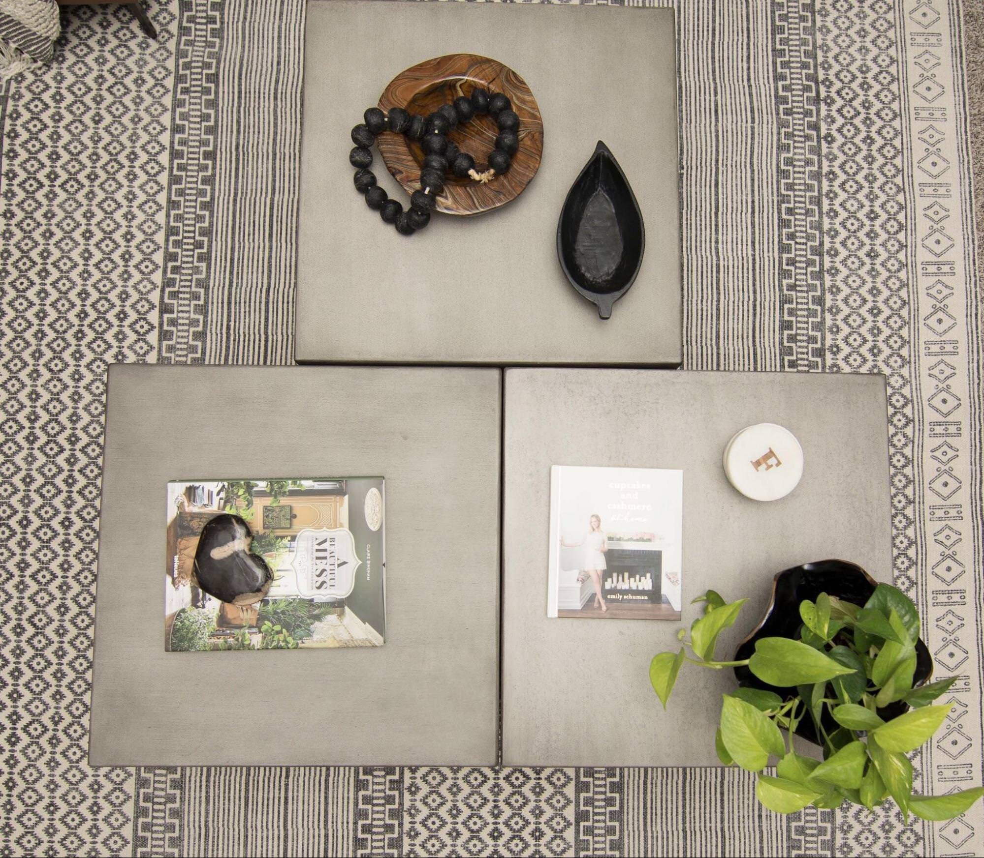 The client had two of these concrete cube coffee tables and I had them purchase an additional one. 3 together looks more interesting and gave us more space and made it all feel to scale for the room.