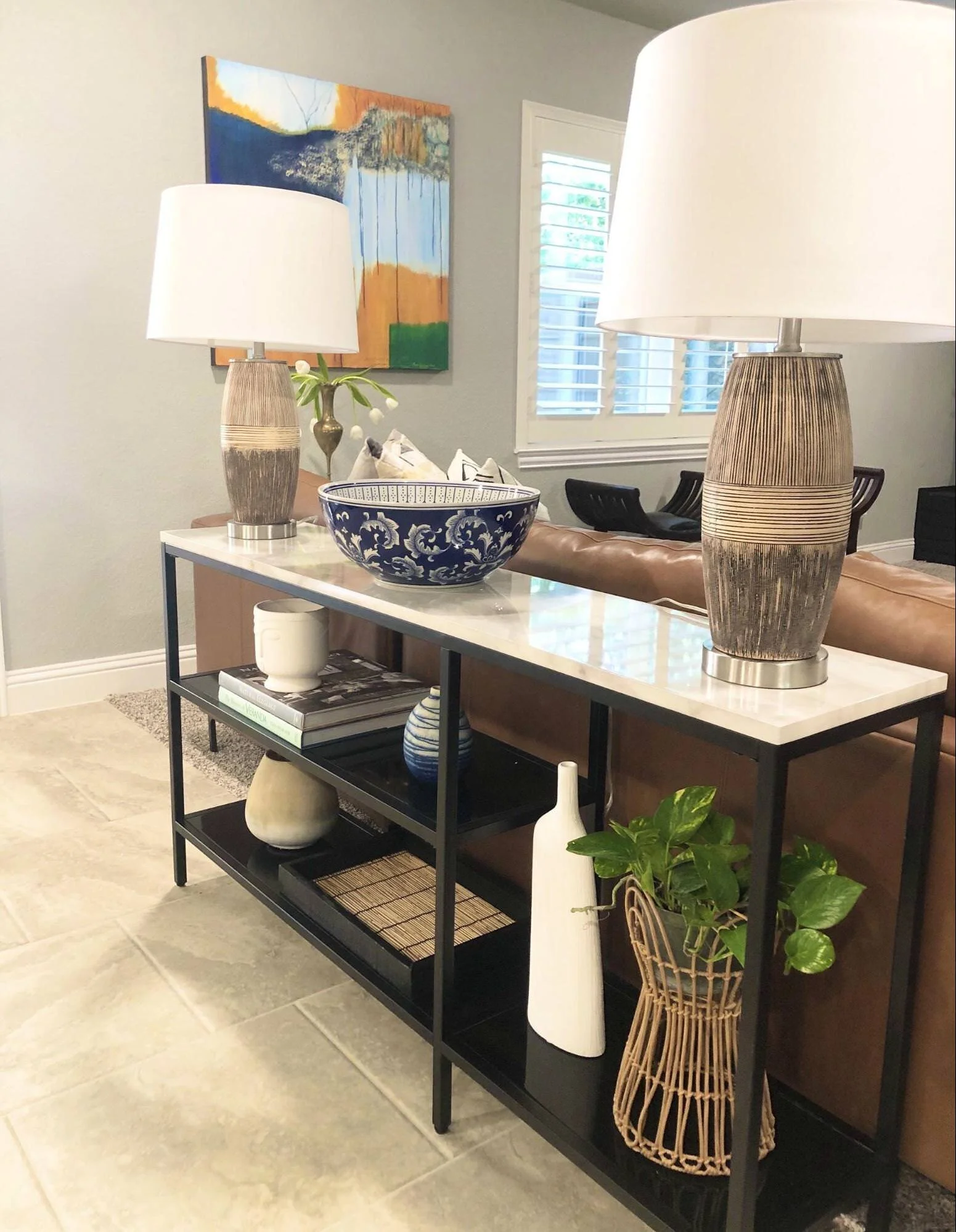 We added a console table behind the sofa because it was a perfect place to add accent lighting in this small living space. It created balance to the room.