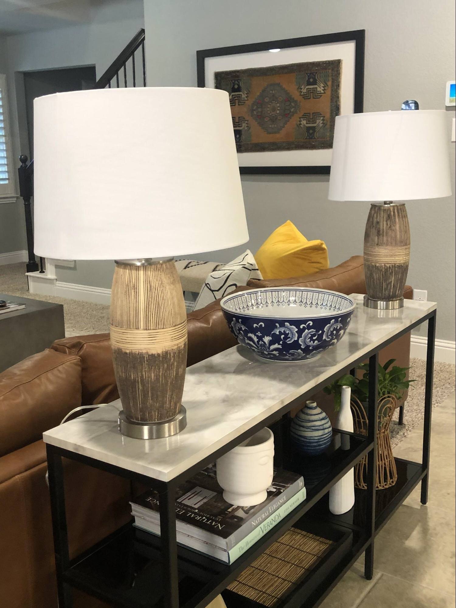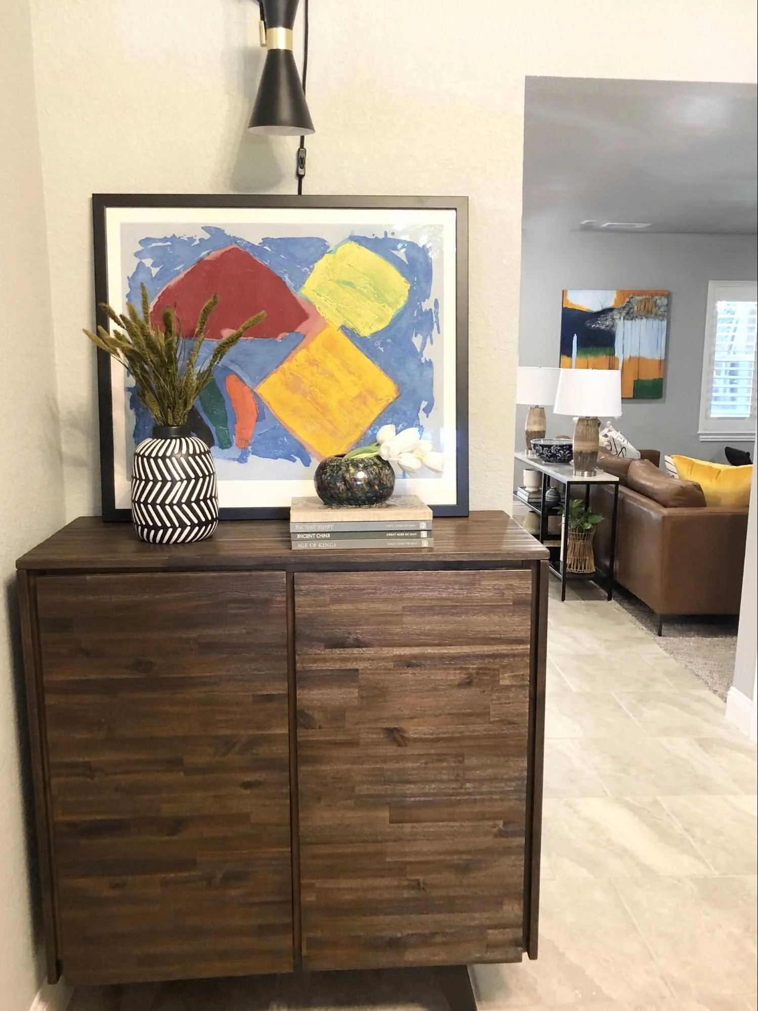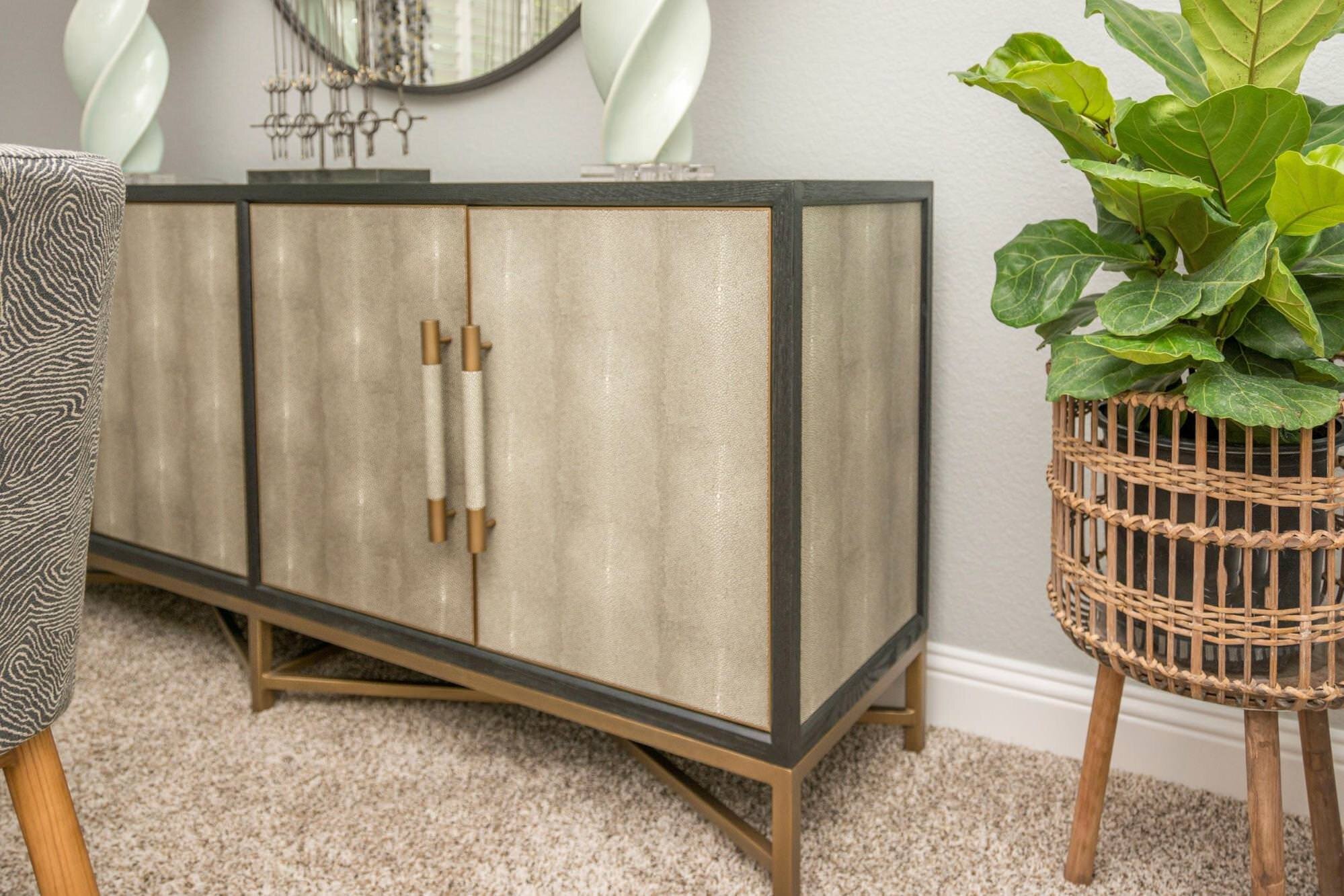 Since the buffet has detail already, I felt like we didn’t need a lot of accessories on it. We kept it simple but it still makes a bold statement. The lamps with the acrylic bases say, wowza