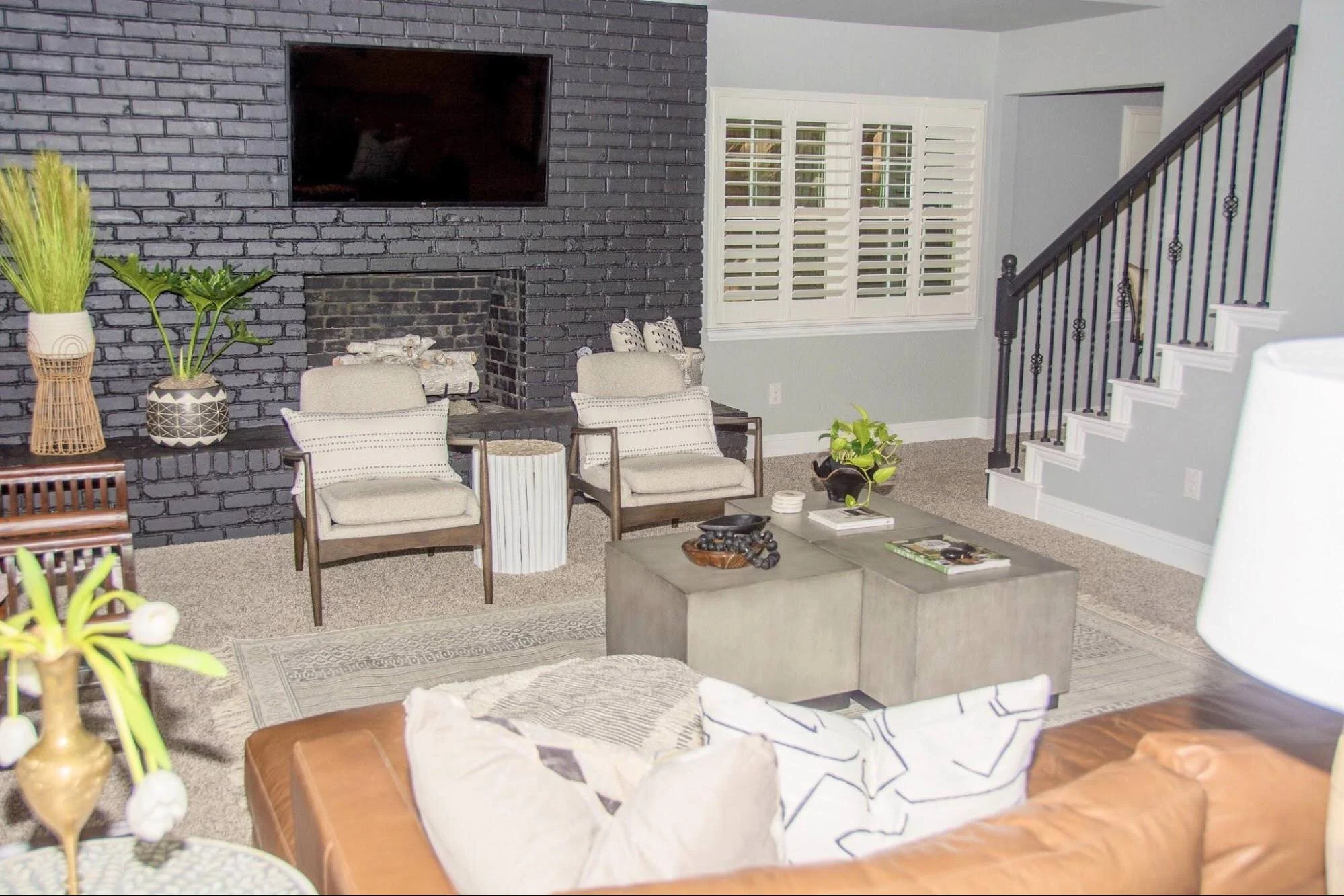 We added a black and white rug and it really pulled the black from the fireplace and united the space. We added accessories that can easily be moved if they decide to have dinner or party food in front of the TV.