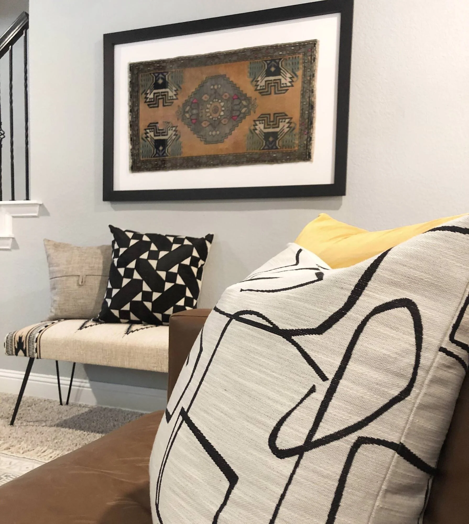 I found this vintage rug and had it framed! Placed above this hair pin bench worked lovely with the warmth from the sofa!