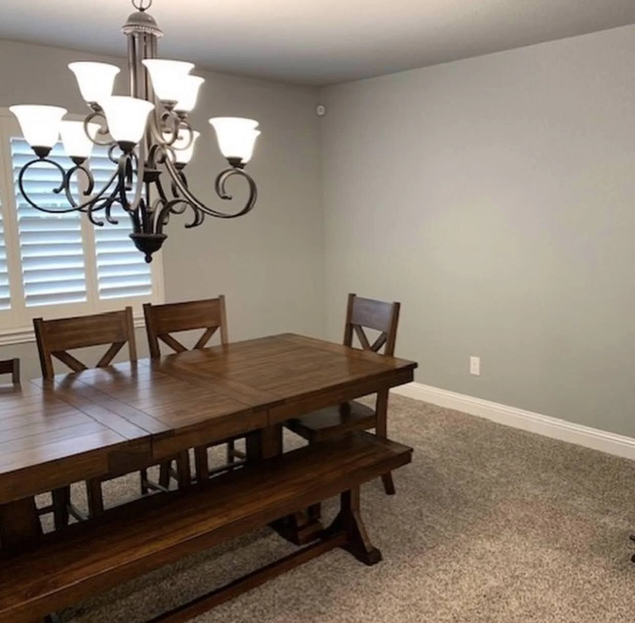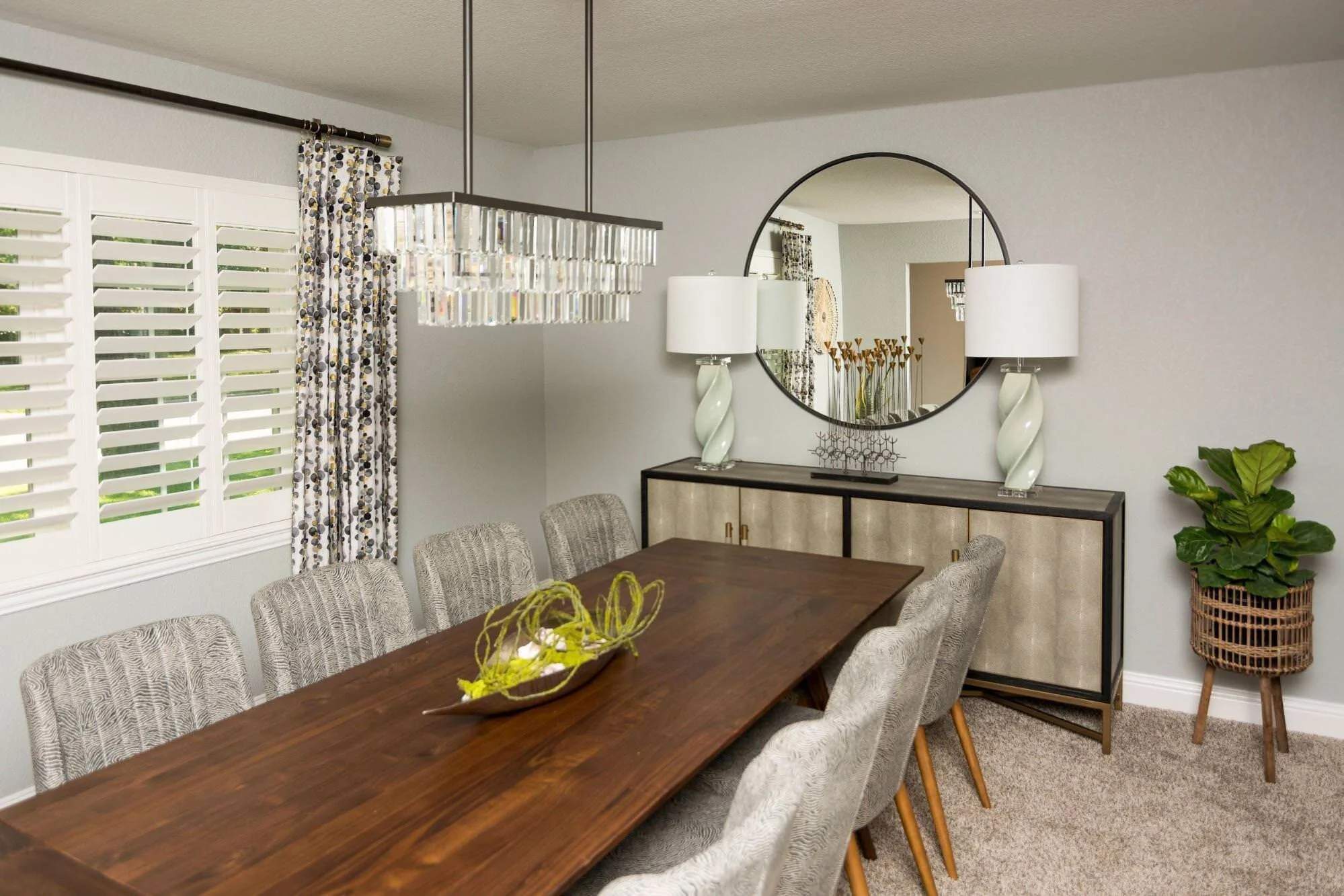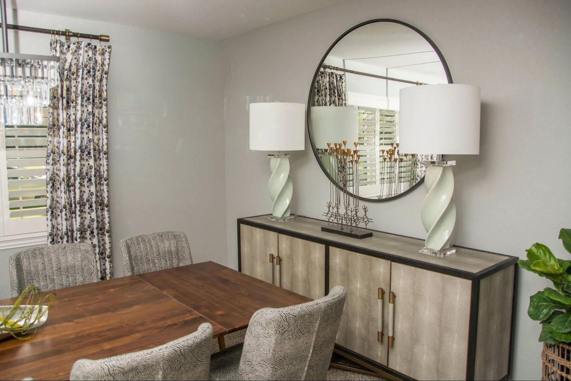 I added a round mirror because we had a lot of square going on in the room. The round mirror opened up the space too! The dining room is right off the entry so it really makes it inviting! Always make sure that what your mirror reflects is something pretty! This chandelier is certainly that!