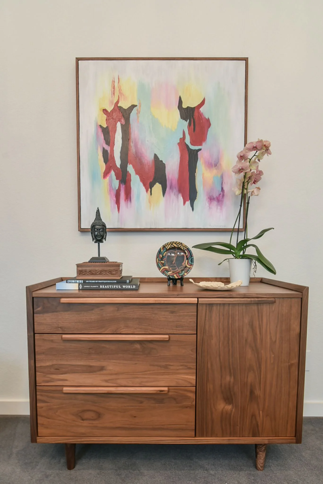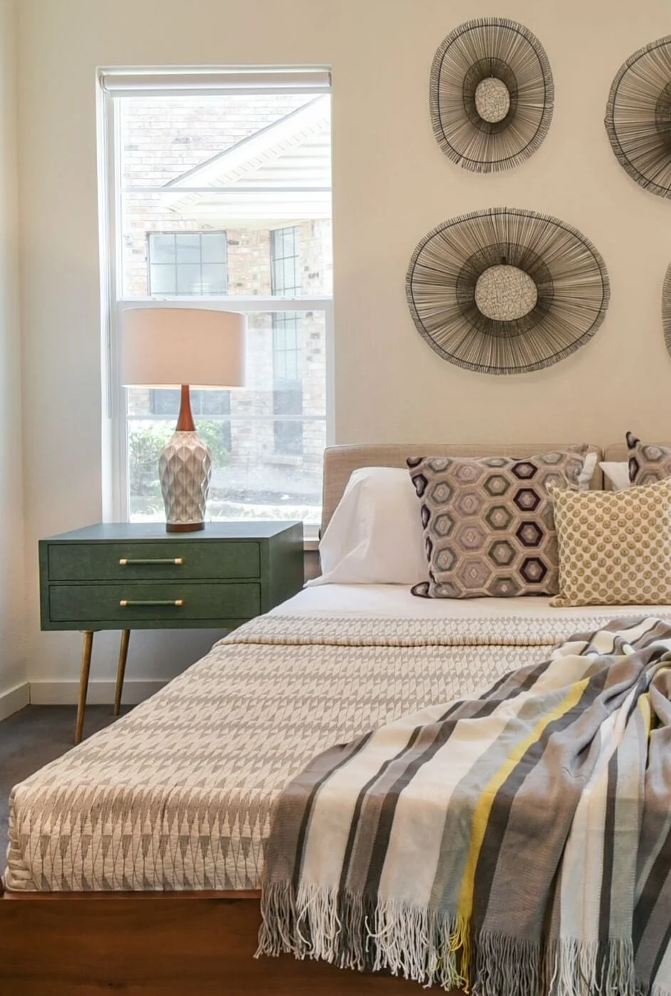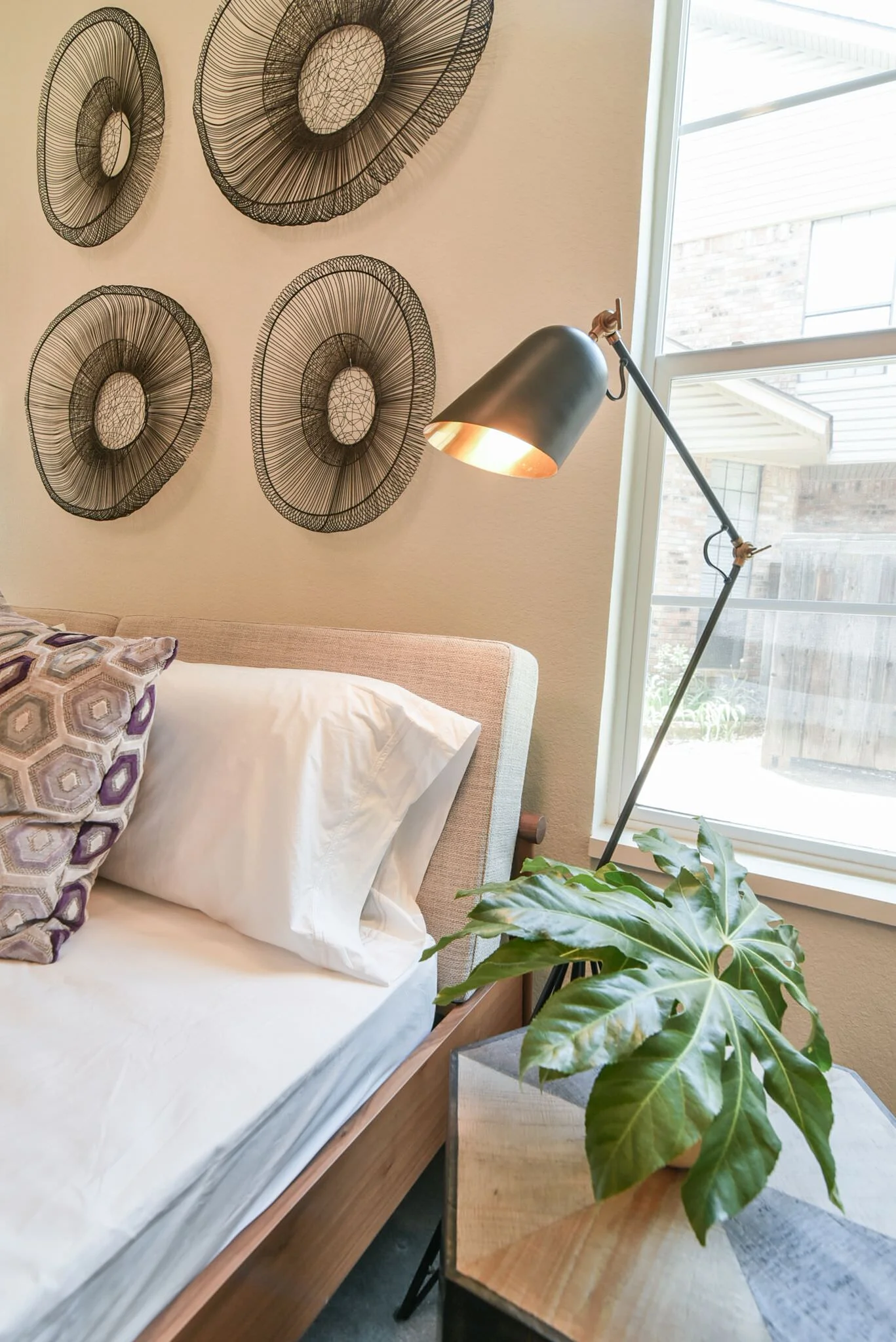 I love the mid-century modern dresser that we chose. It isn’t too big for the space and coordinates with their bed. The custom artwork by Grapevine, TX artist Mary Howe is incredible. I gave her the colors of the quilt and she created a masterpiece for us. The pops of yellow make me feel happy! I wanted to make sure I didn’t over decorate the dresser. The key to modern design is minimalism, no clutter. I think we achieved that without making it feel to cold and impersonal.