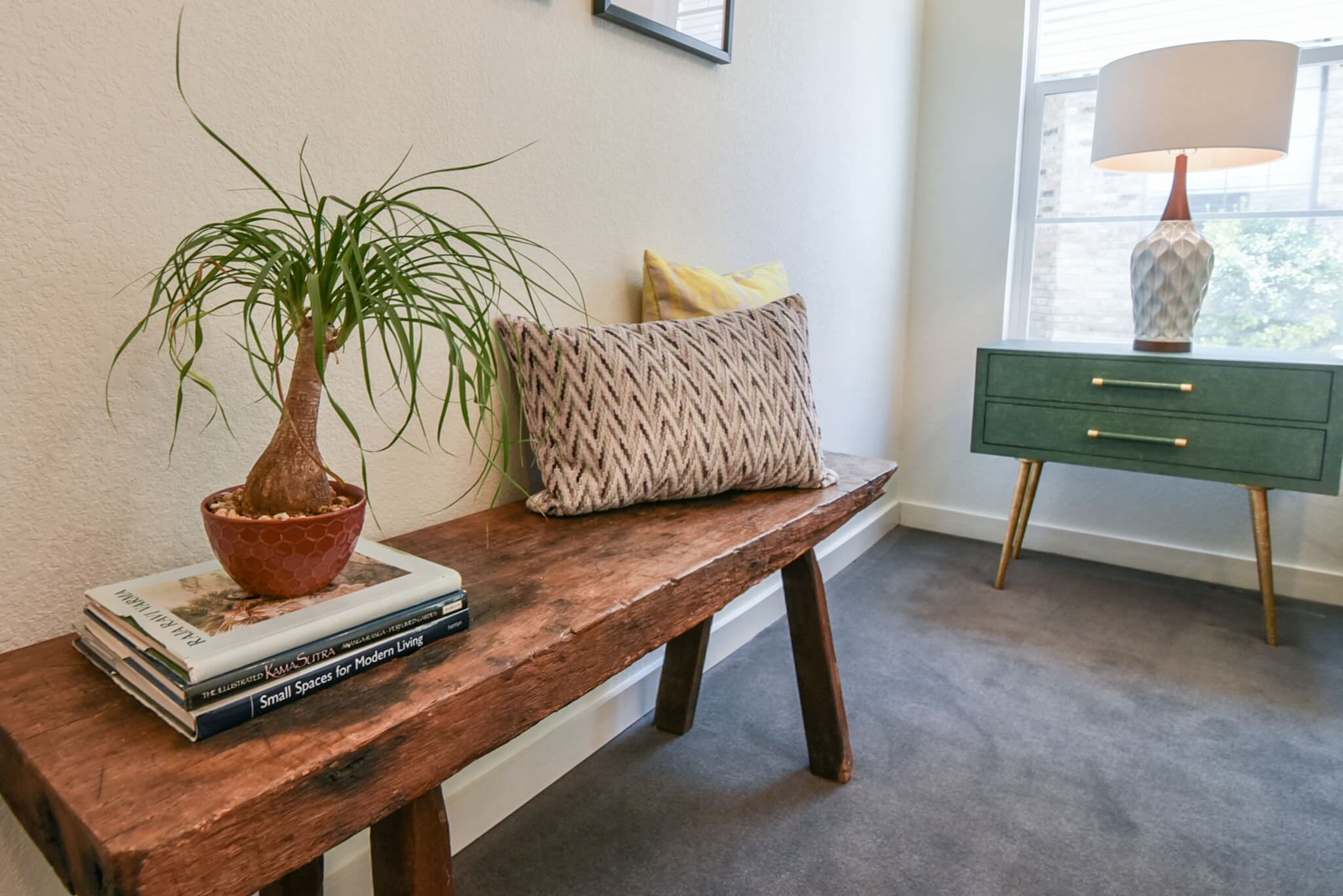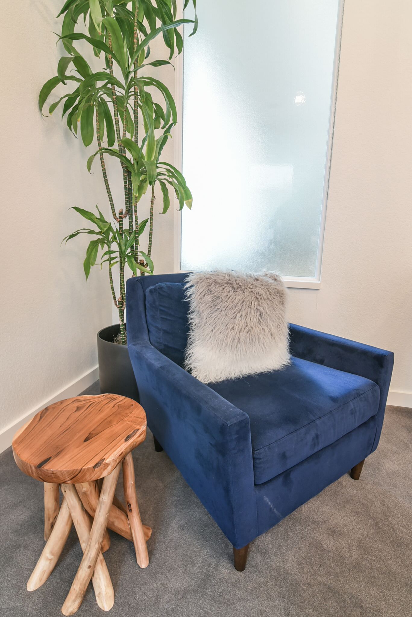 We moved this chair in from another room. Added a gray fuzzy pillow and a natural wood side table. We also brought the large plant in from another room to add height to that corner.