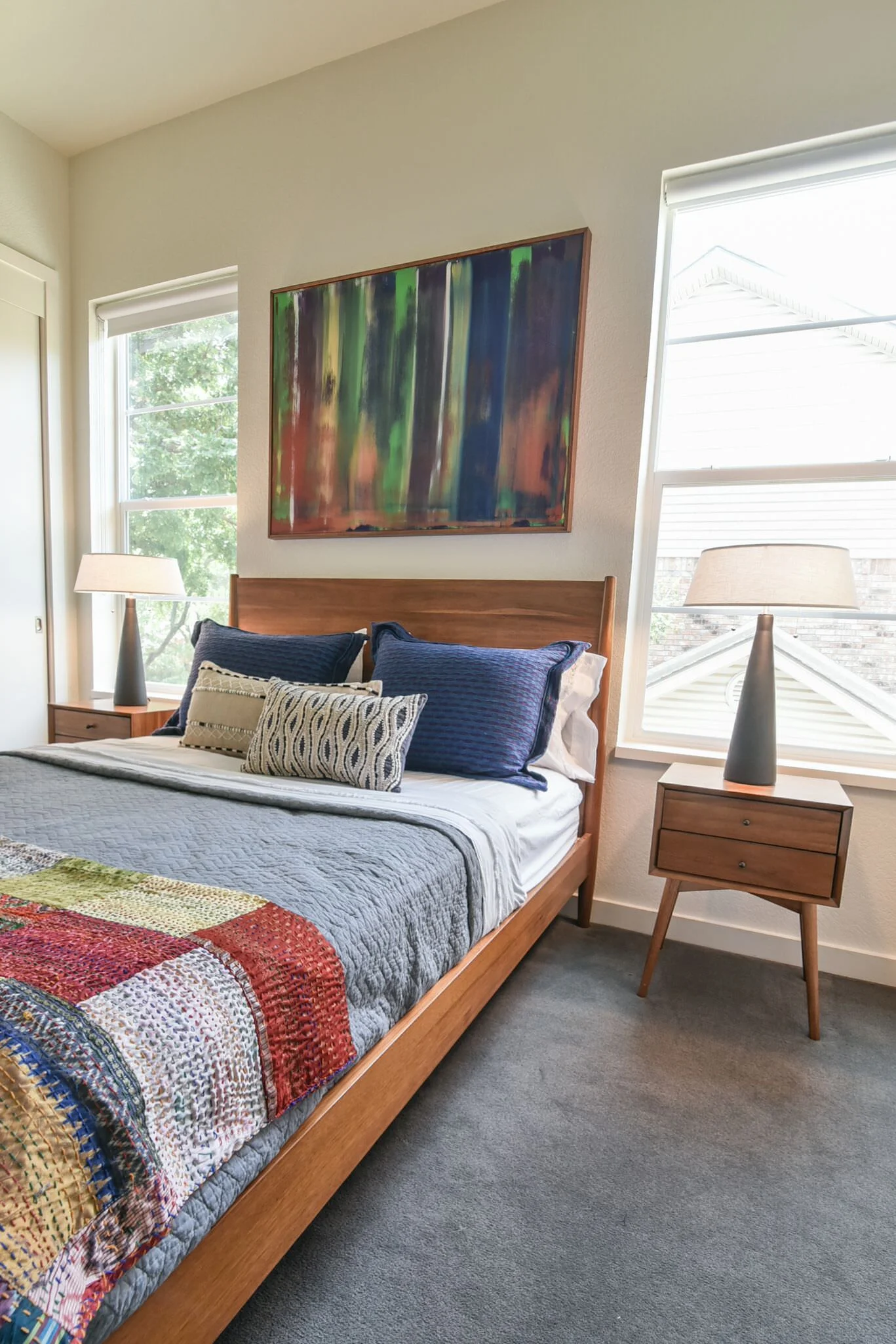 We added new lamps to the nightstand because the others were too short for the scale of the bed. The client painted the painting above the bed, isn’t he talented? We added a custom wood frame to it and it looks perfect between the windows. The colors in the painting were my inspiration for the bedding and the other selections in the room.