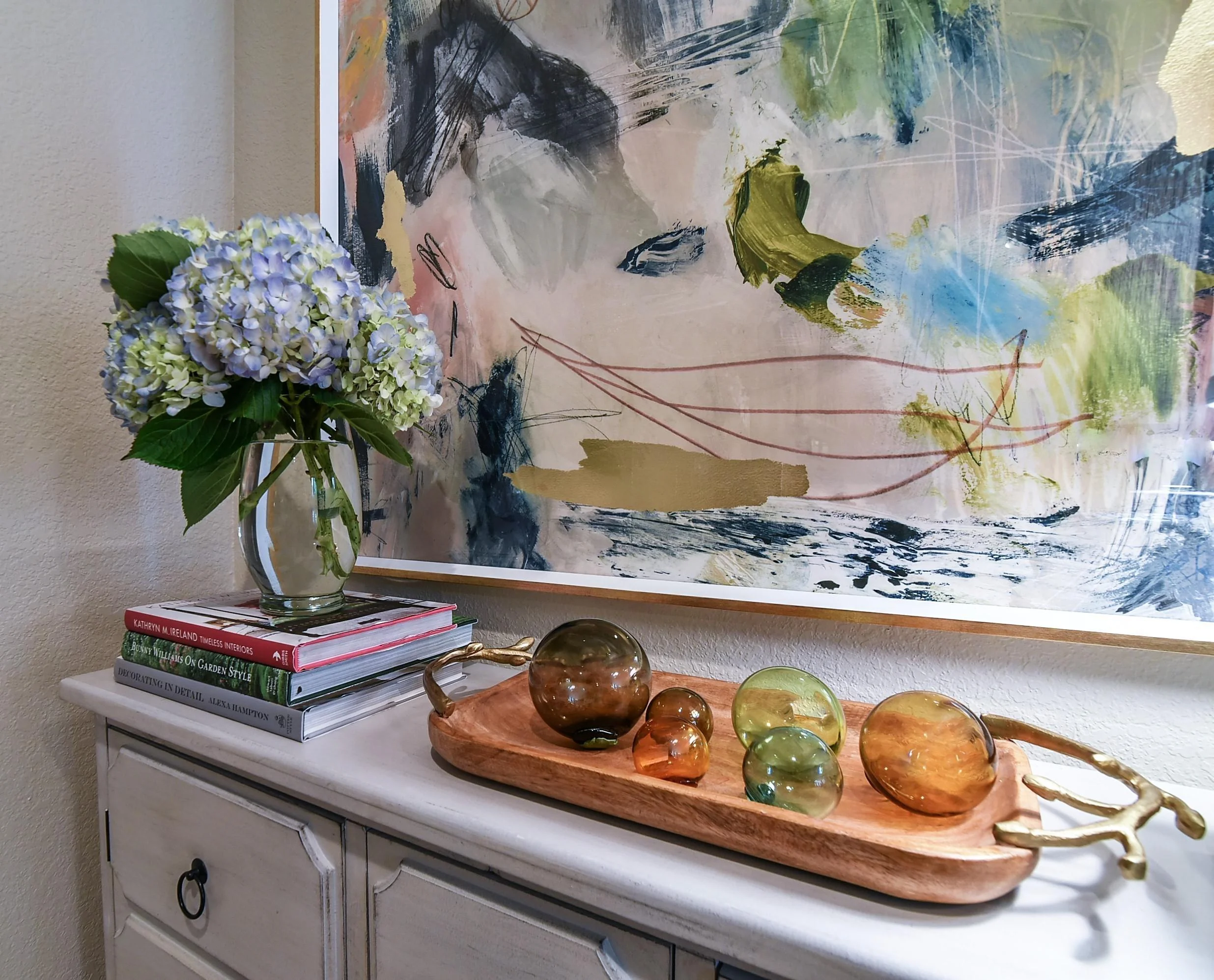 Using blown glass balls, layered on a wood tray, continues the playful spirit this little corner expresses. The fresh hydrangeas will last a while and she will love replacing them as she entertains guests. They couldn’t be a better flower with that painting.