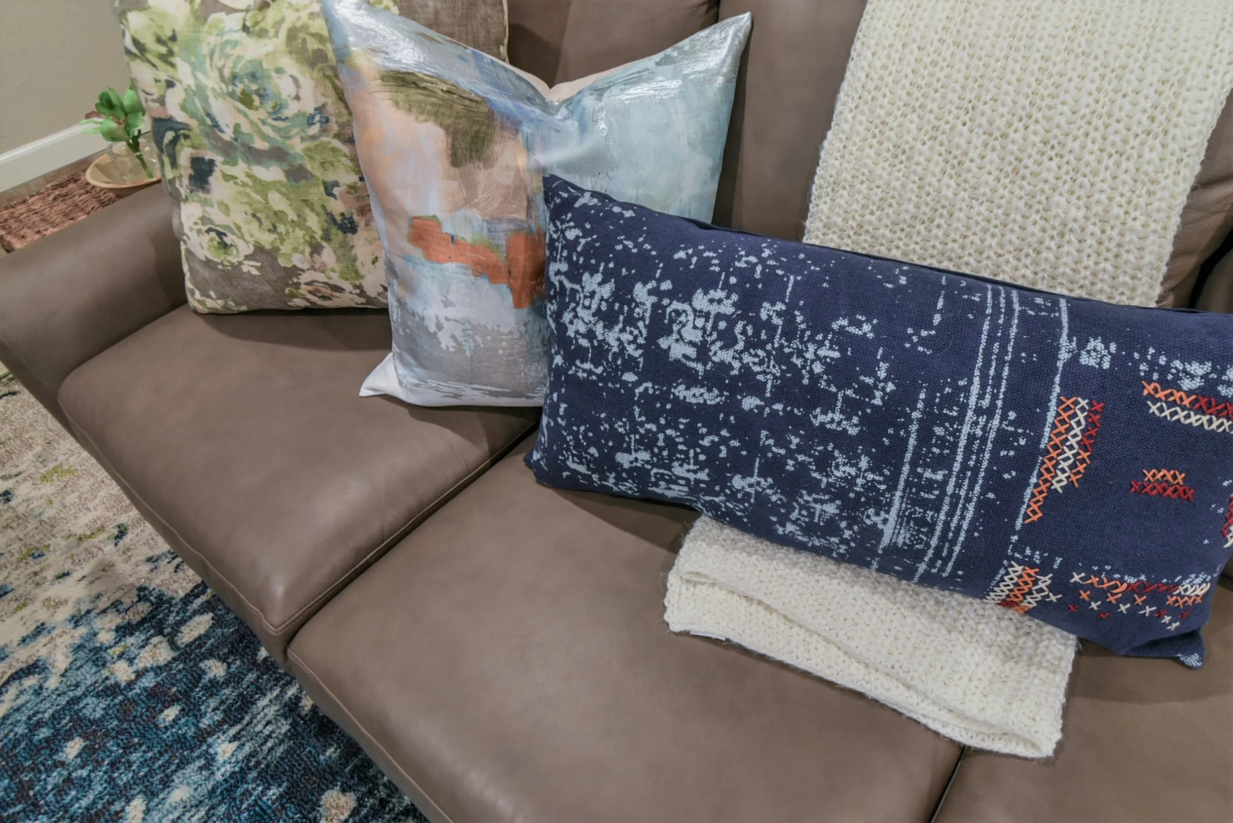 A grouping of fabulous mix and match assortment of pillows as well as a throw brings it all together and makes the painting feel less alone.