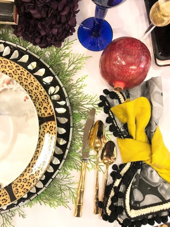 I worked with Replacements.com for this event, they sent me the amazing leopard print dinner plates as well as the gold bamboo silverware. They also provided the beautiful crystal gold ball wine glass.