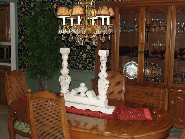 Great architectural piece I found at an Antique store, created from an old banister.  Because the dining room has so much pattern on the walls from the wallpaper I wanted to add a SIMPLE rustic element to make the room feel more casual and inviting.
