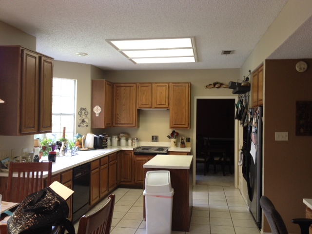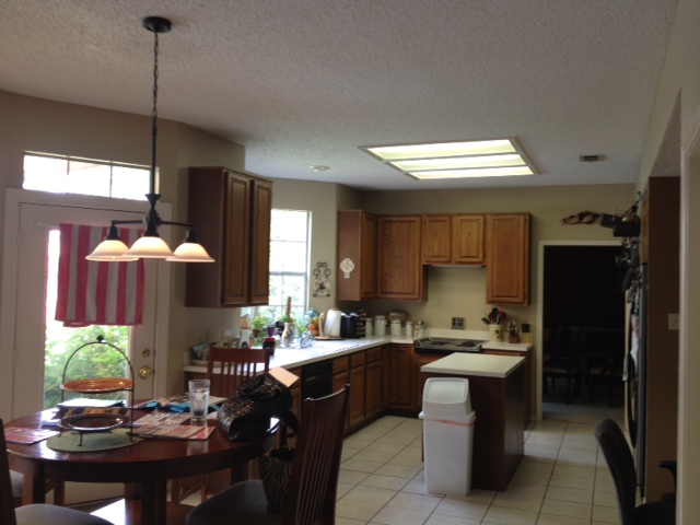 They have a wonderful home in a very wooded area. They purchased the home because of the amazing backyard and the rustic, casual feel of the home. They love all the wood that is in the interior but felt that the kitchen was too dark. I totally agreed.