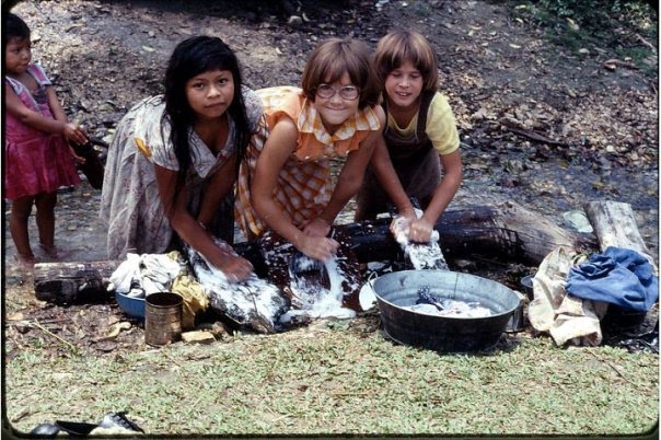 My sister and I washing clothes in the stream with our friend Cecillia.